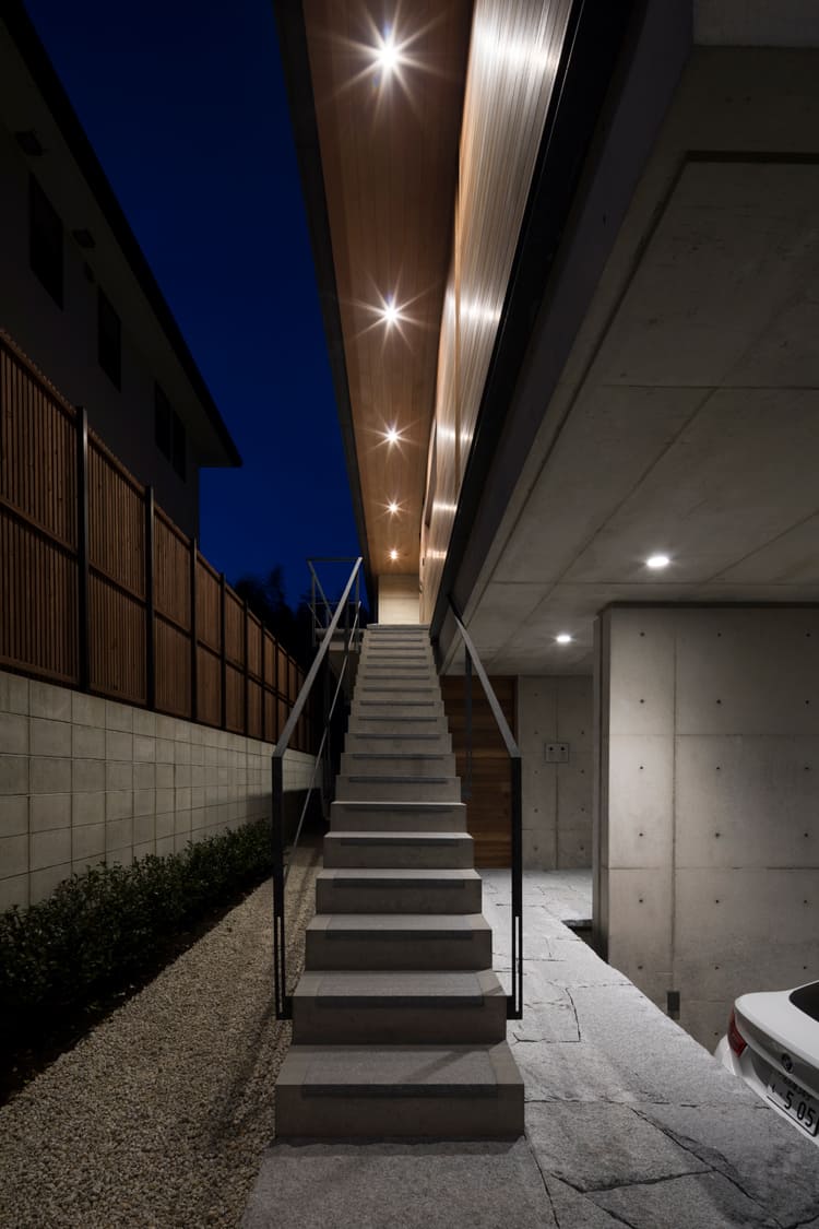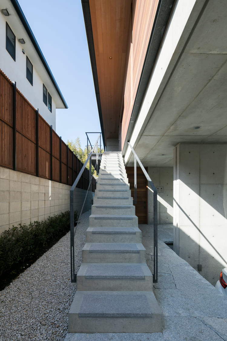 地上から、天空のプライベート空間へと誘うのは、屋外に設けられた、長くて美しい階段です。