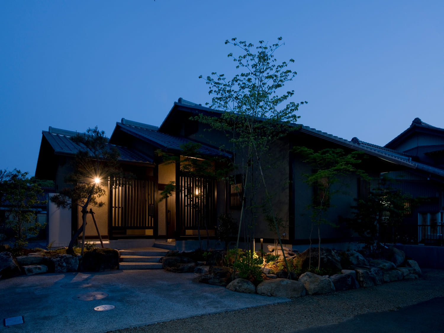 どっしりとした瓦屋根、落ち着いた塗り壁、そして建物と一体となって佇む、手入れの行き届いた木々や石組み。昼の光の下では、まるで昔からそこにあったかのような堂々とした風格で街並みに溶け込みます。そして夜、温かな光に照らし出されると、その表情は一変。光と影が建物の凹凸や木々のシルエットを幻想的に浮かび上がらせます。