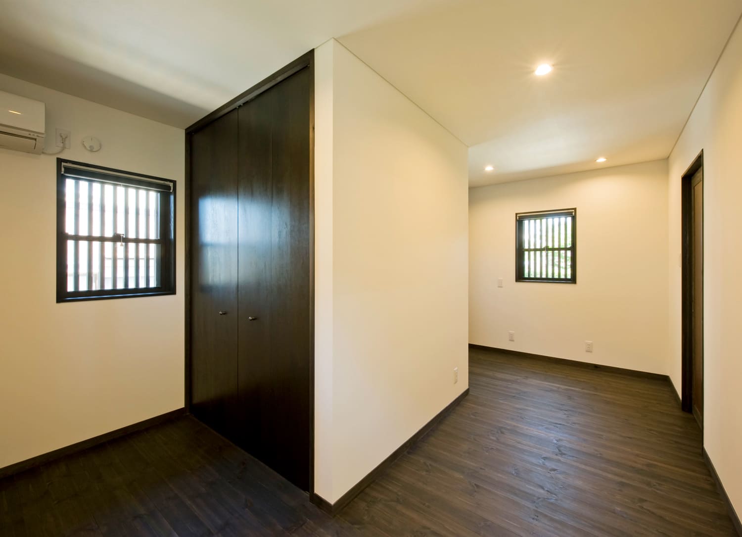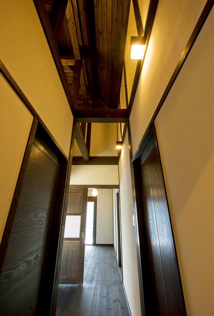 この家の廊下は、単に部屋と部屋を繋ぐ通路ではありません。黒く磨かれた床、趣のある木の建具、そして、格子窓から差し込む光と影。歩を進めるたびに、まるで懐かしい時代にタイムスリップしたかのような、心安らぐ感覚に包まれます。