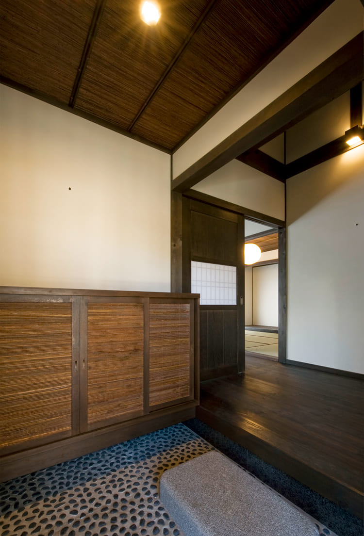 【玄関】一歩入れば、そこは非日常。もてなしの心を表す、美しい玉砂利の土間。