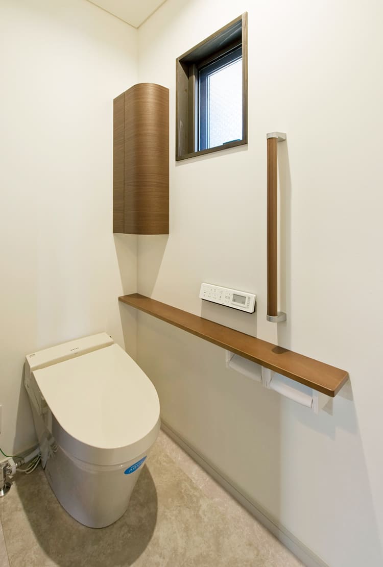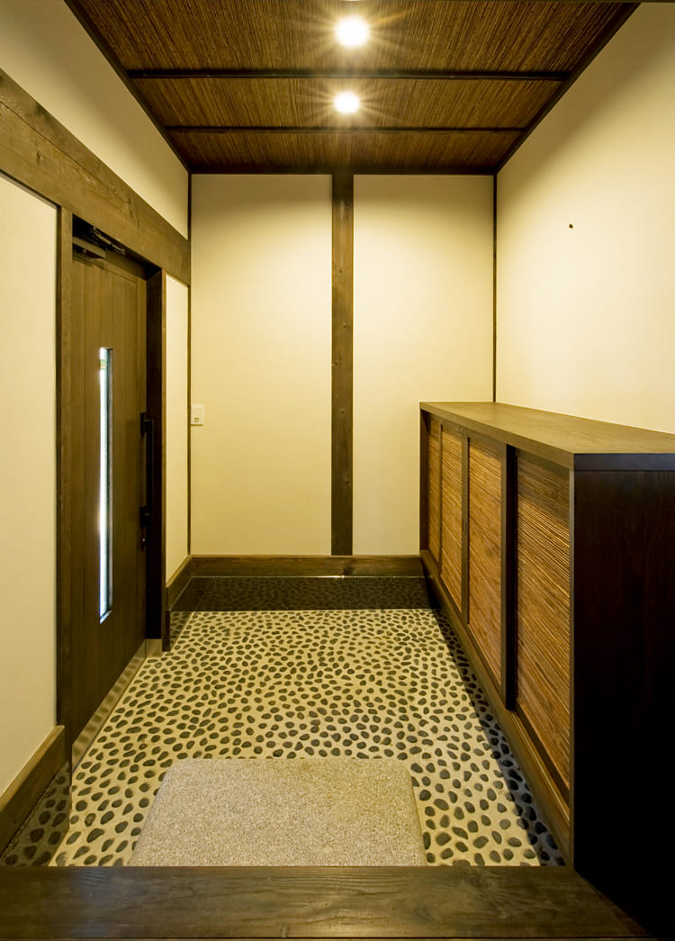 我が家へと誘う玄関は、まるで高級旅館を思わせる趣のある空間。床には職人の手仕事が光る玉砂利の洗い出し仕上げをあしらいました。扉を開けた瞬間、外の喧騒から切り離され、心静かな世界が始まります。訪れるお客様を丁寧におもてなししたい、そんな住まい手の心が伝わってくるような、自慢の我が家の顔です。