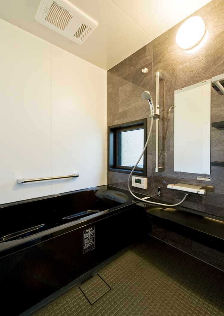 落ち着いたダークな色調で統一された、シックでモダンなバスルーム。ゆったりとしたバスタブが、一日の疲れを優しく癒してくれます。古き良き趣はそのままに、水回りには最新の設備とデザインを取り入れることで、心からリラックスできる、快適な毎日を約束します。