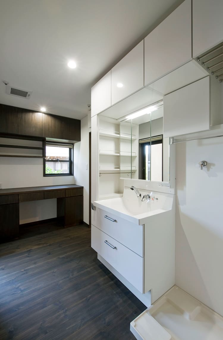 白を基調とした、清潔感あふれる洗面スペース。三面鏡の裏や、カウンターの下など、たっぷりの収納を設けることで、いつでもすっきりと片付いた、美しい空間を保つことができます。忙しい朝の身支度も、スムーズで快適に。