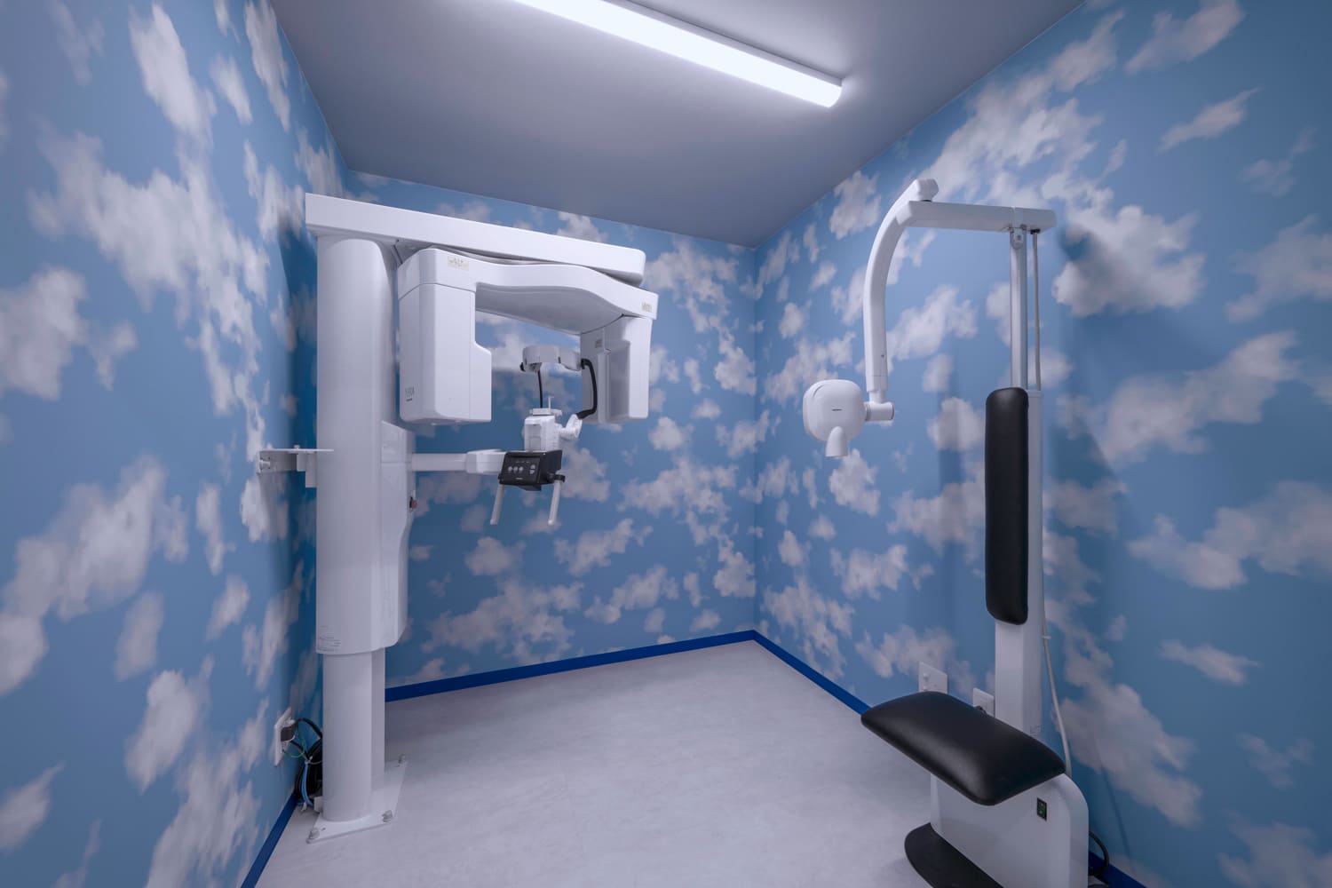 レントゲン撮影など、お子様が少し不安に感じてしまう部屋の壁には、一面の青空を描きました。