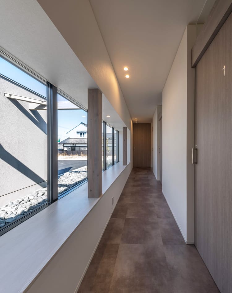 外からの視線は遮りながら、空からの光を、室内にたっぷりと採り入れるための、巧みな設計です。
