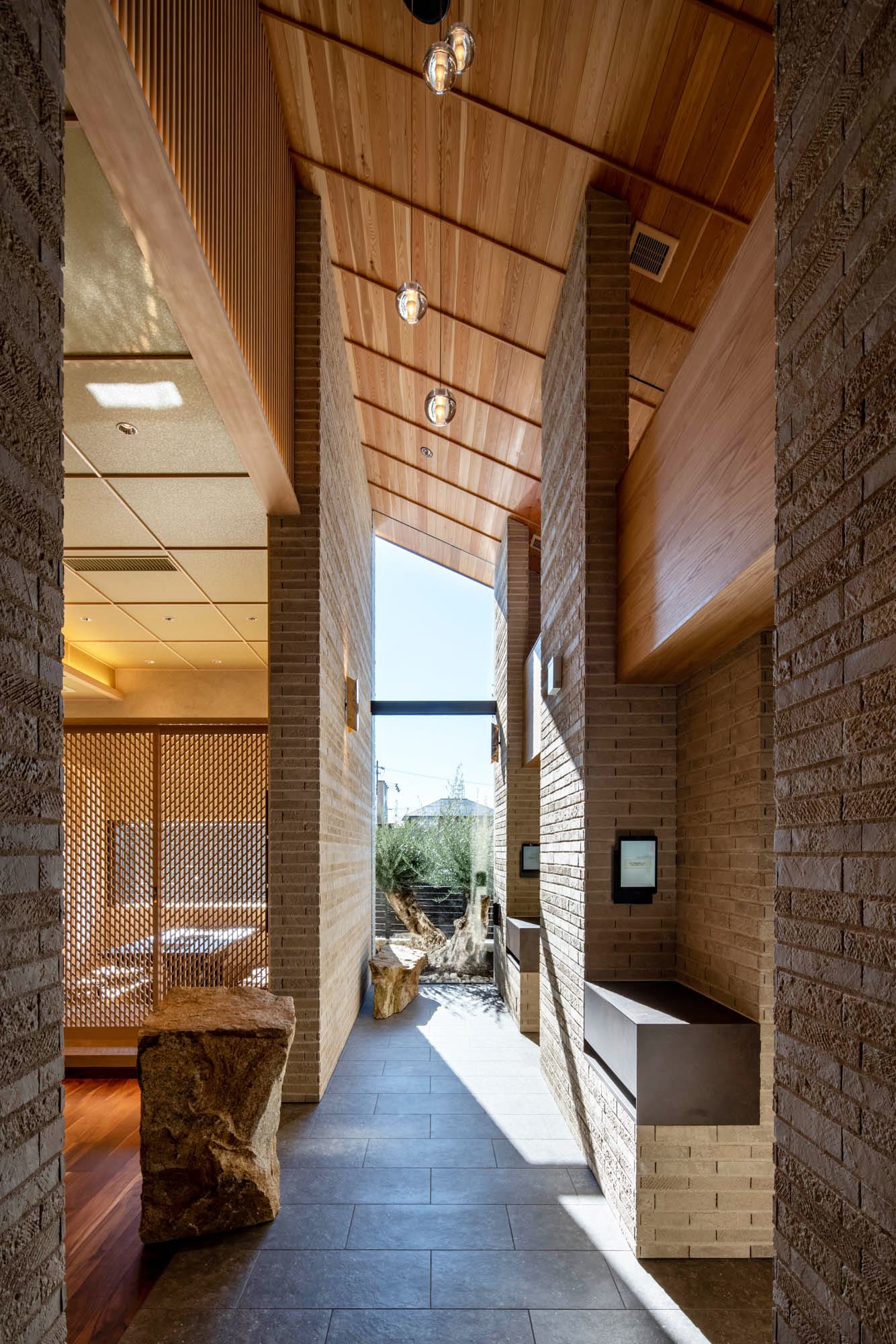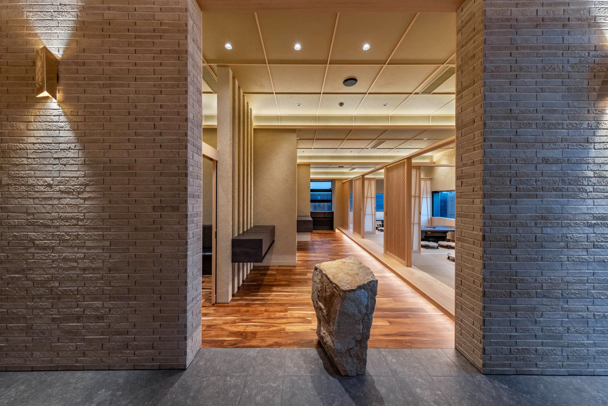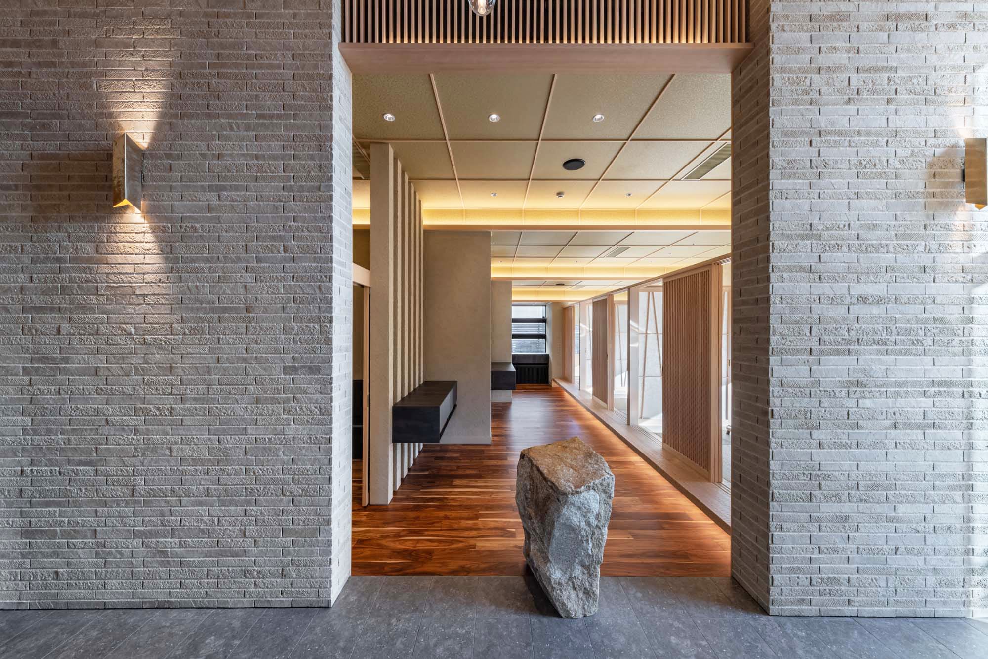 通路の途中に配された自然石のオブジェが、空間に静かな緊張感と趣を与えています。