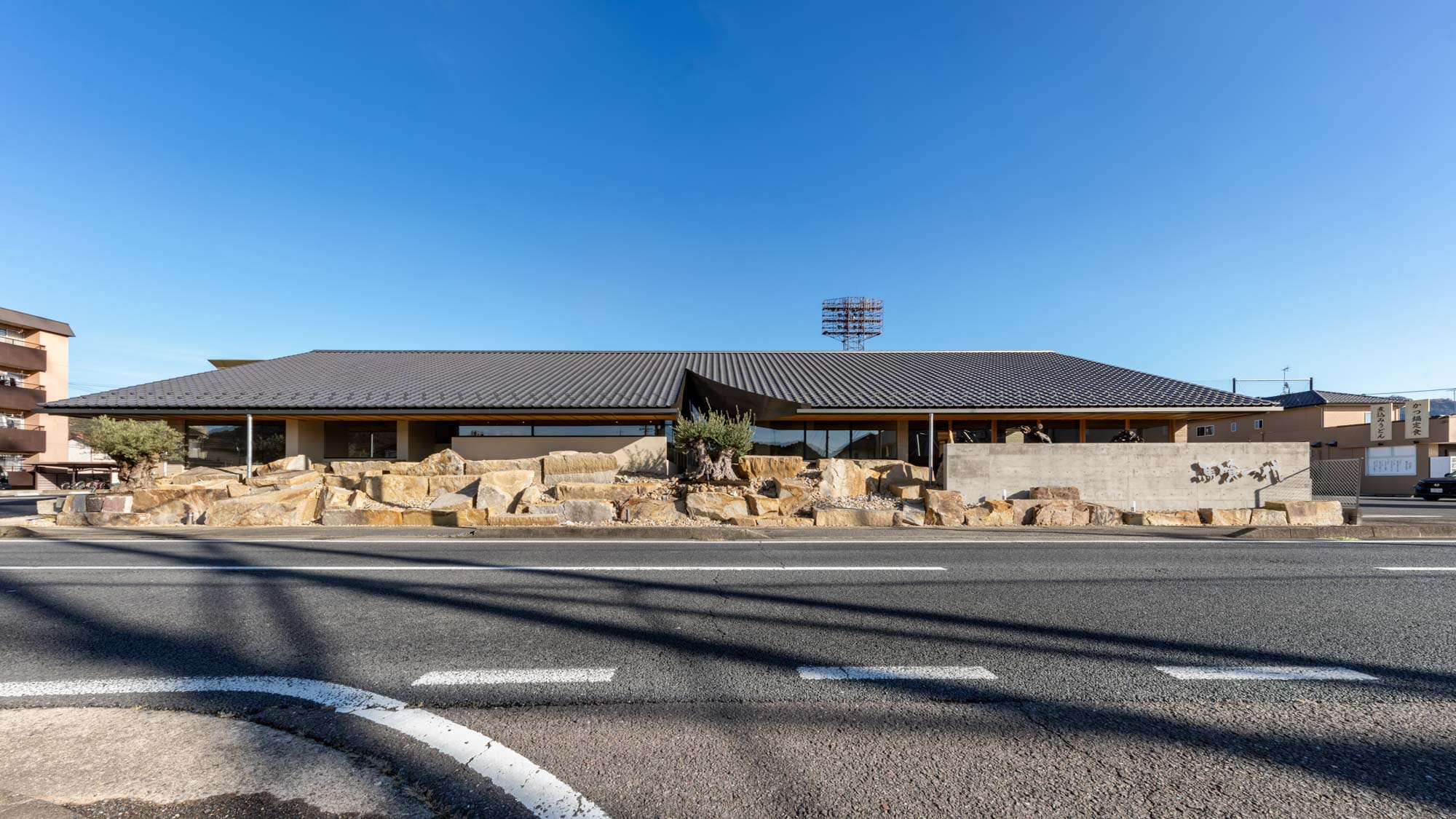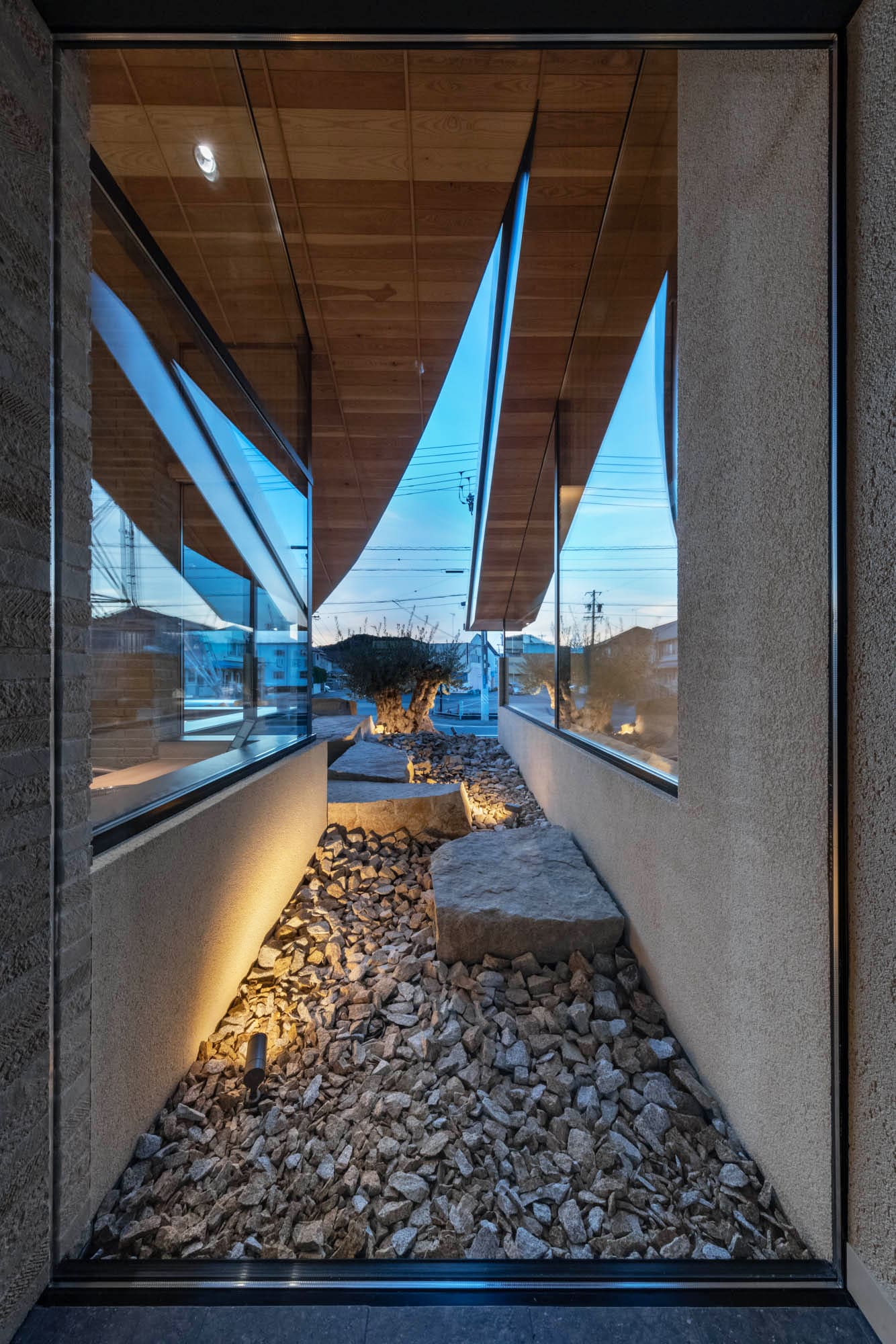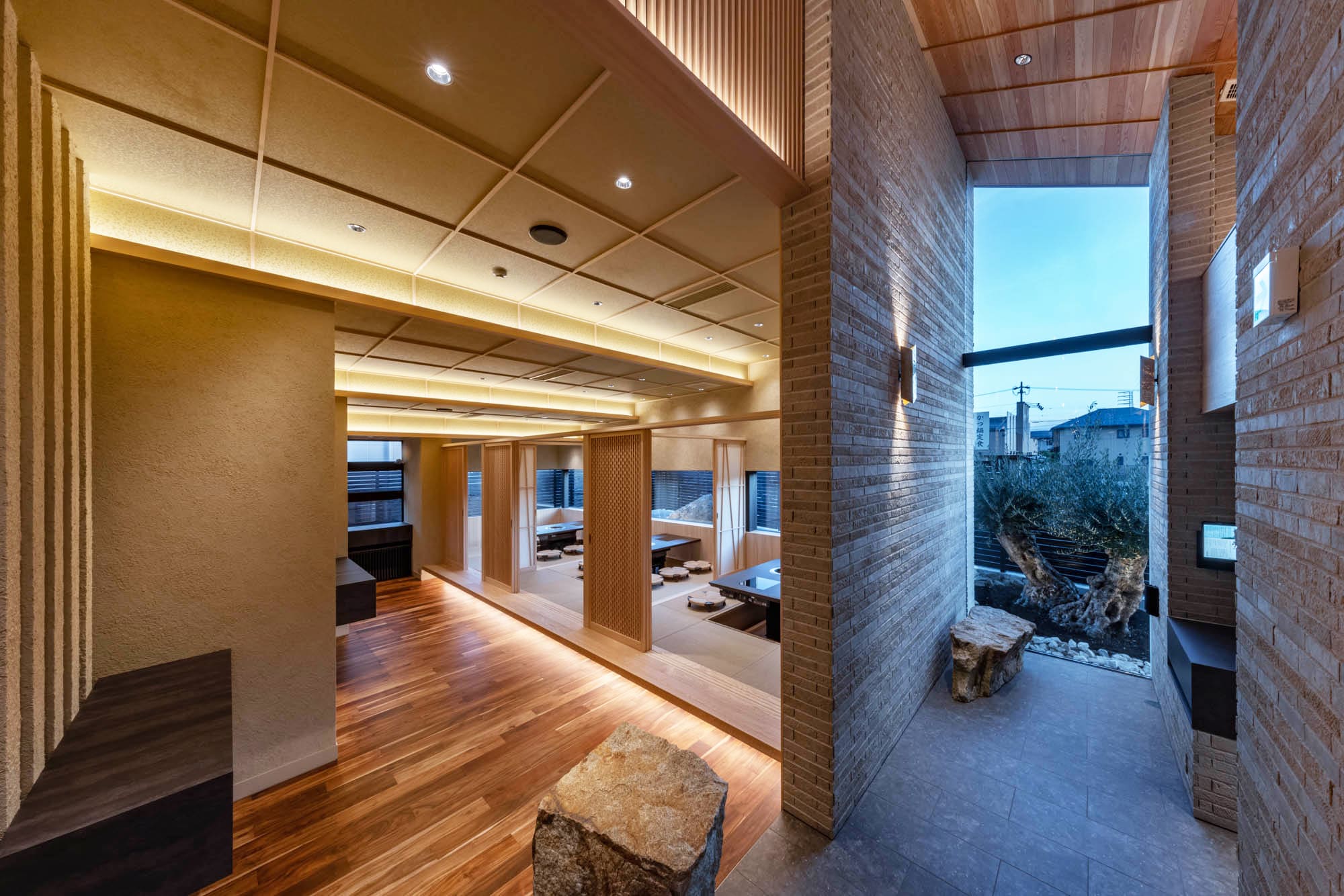 通路の途中に配された自然石のオブジェが、空間に静かな緊張感と趣を与えています。