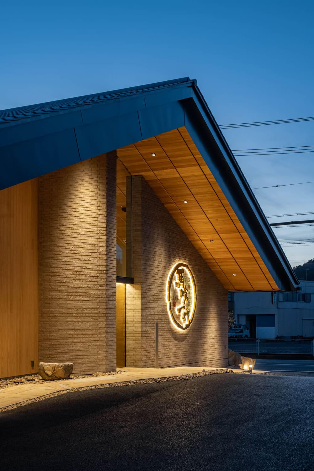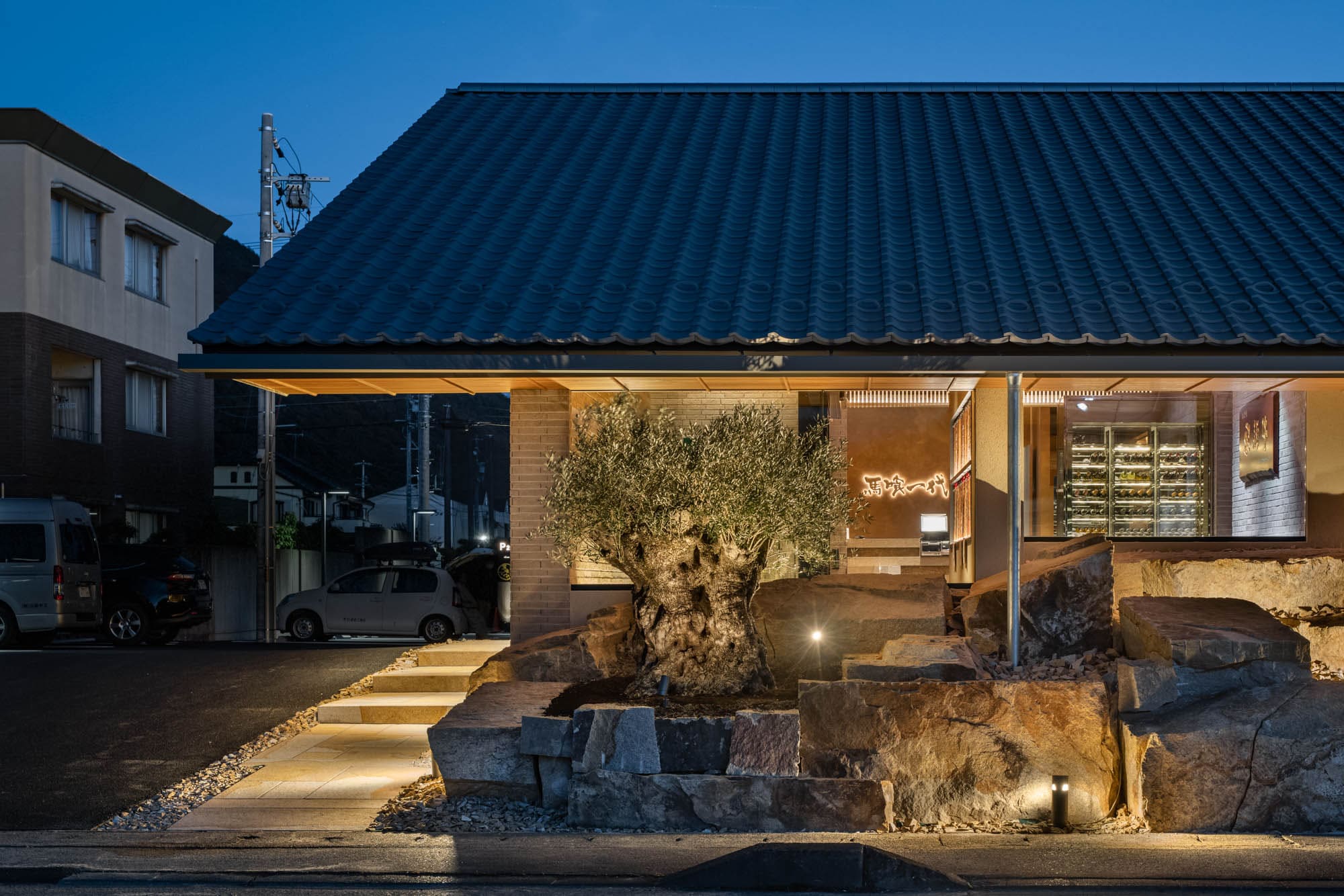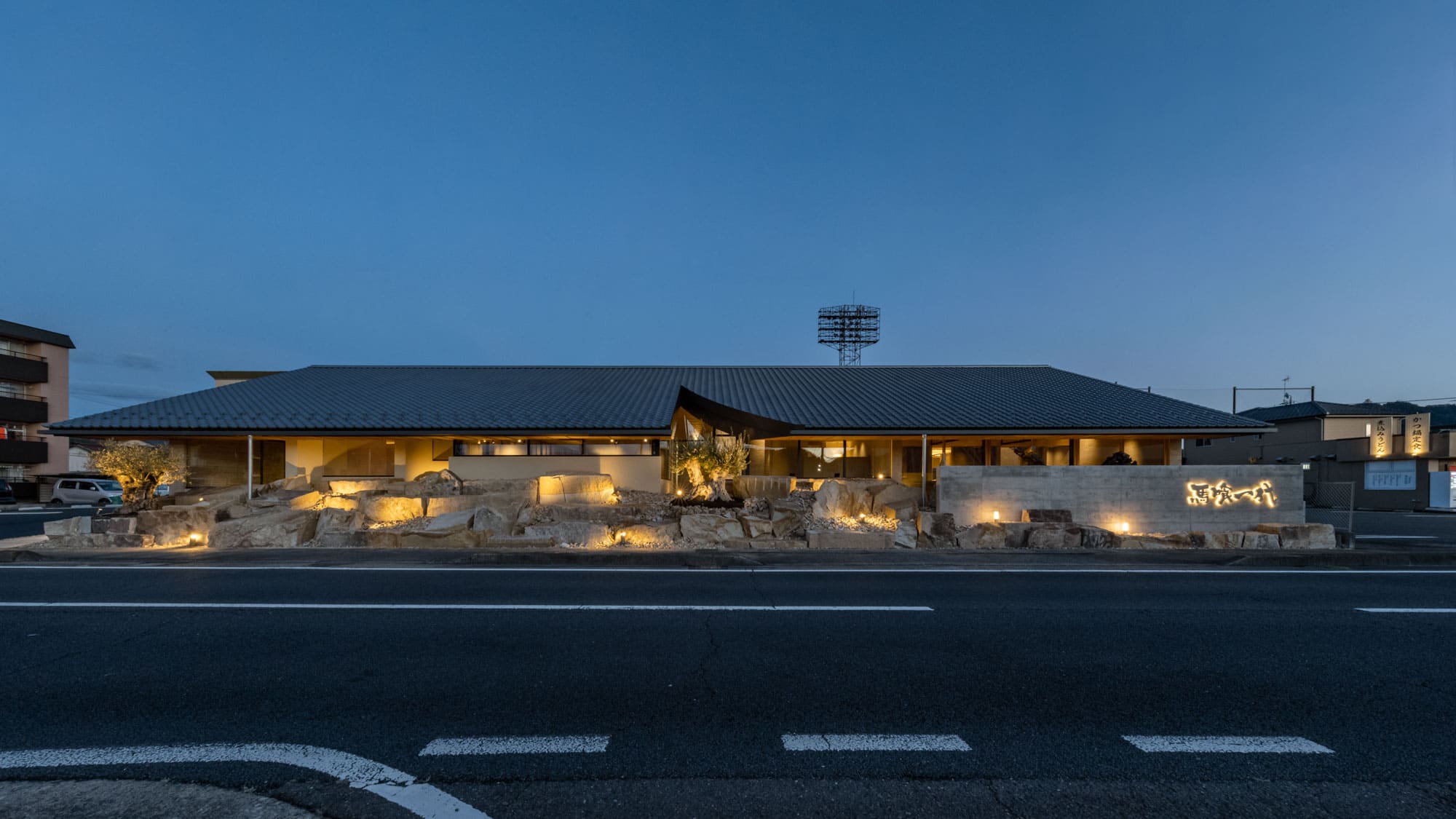 夜には、計算された照明が、ごろた石の石垣や木々を幻想的に照らし出し、建物全体がひとつのアート作品のように浮かび上がります。