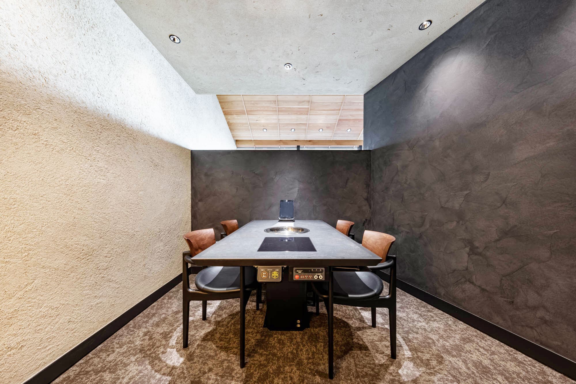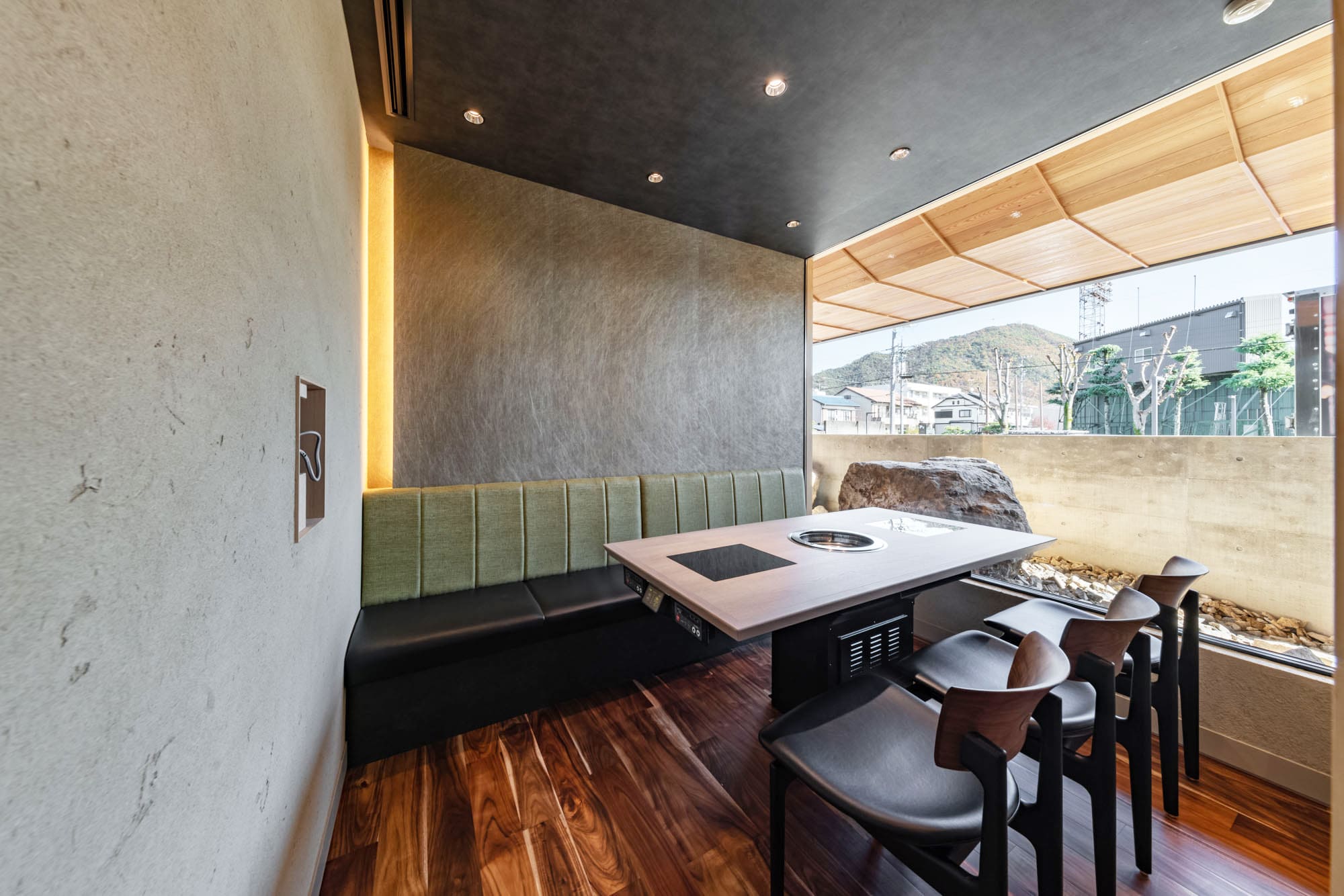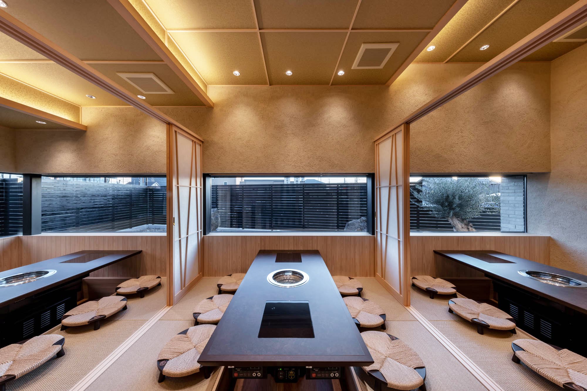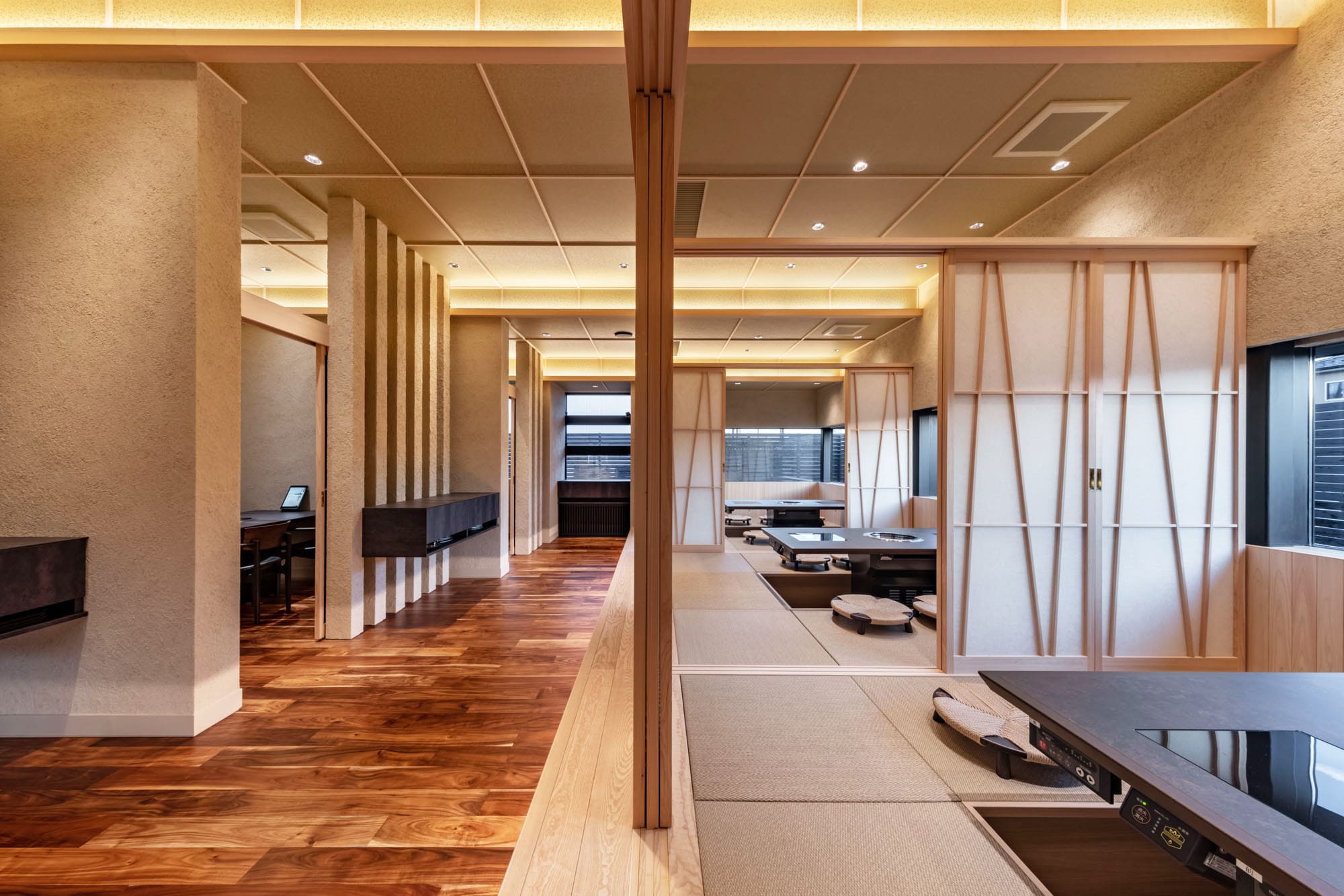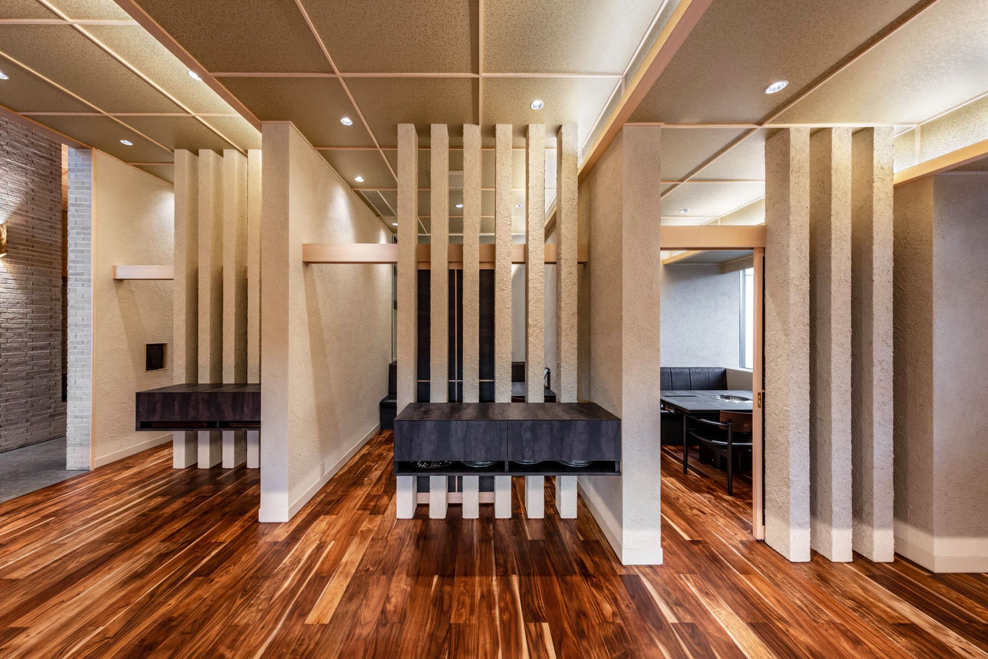 繊細な組子細工のような格子戸で仕切られた空間は、和の趣を感じさせながら、モダンで洗練された雰囲気。