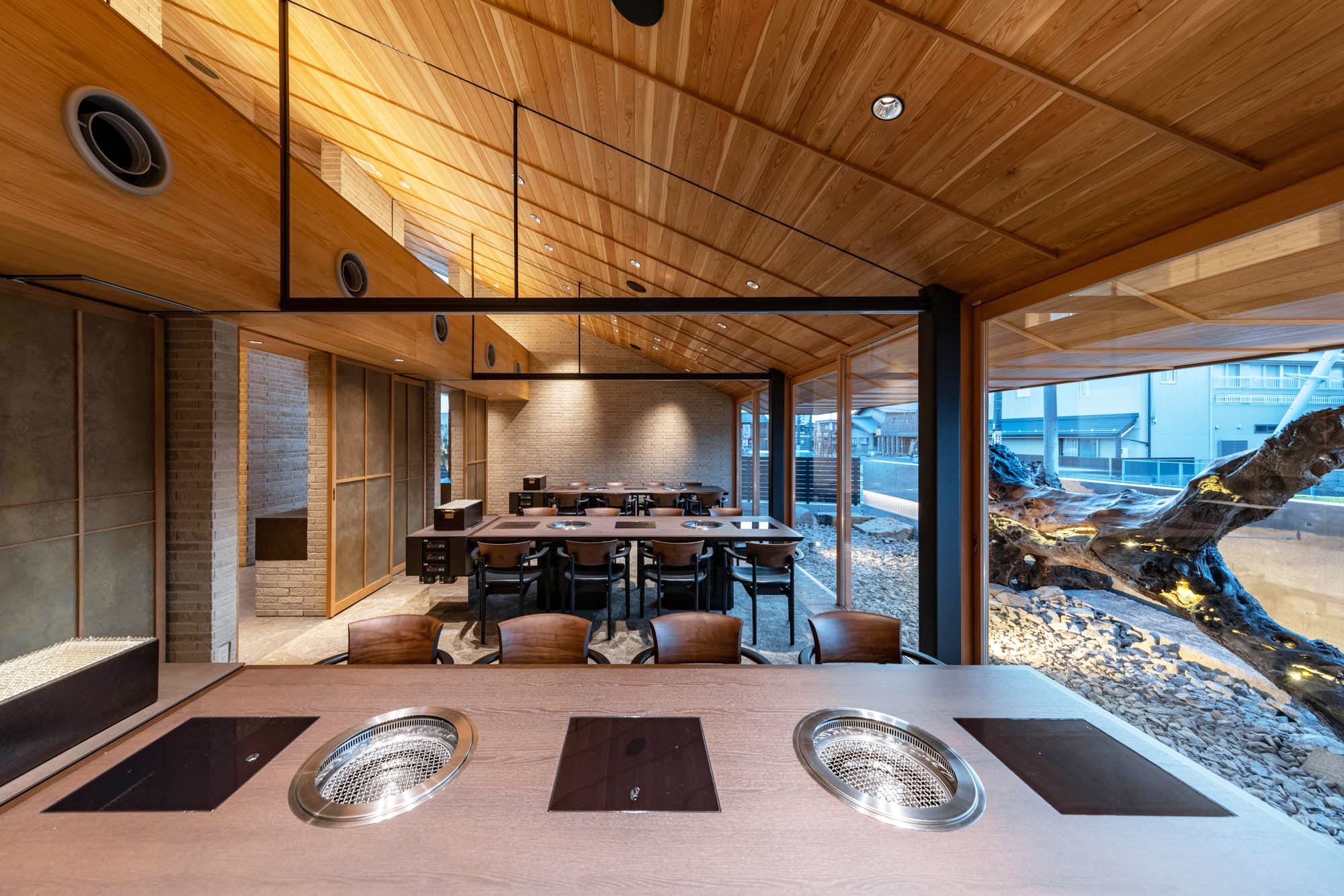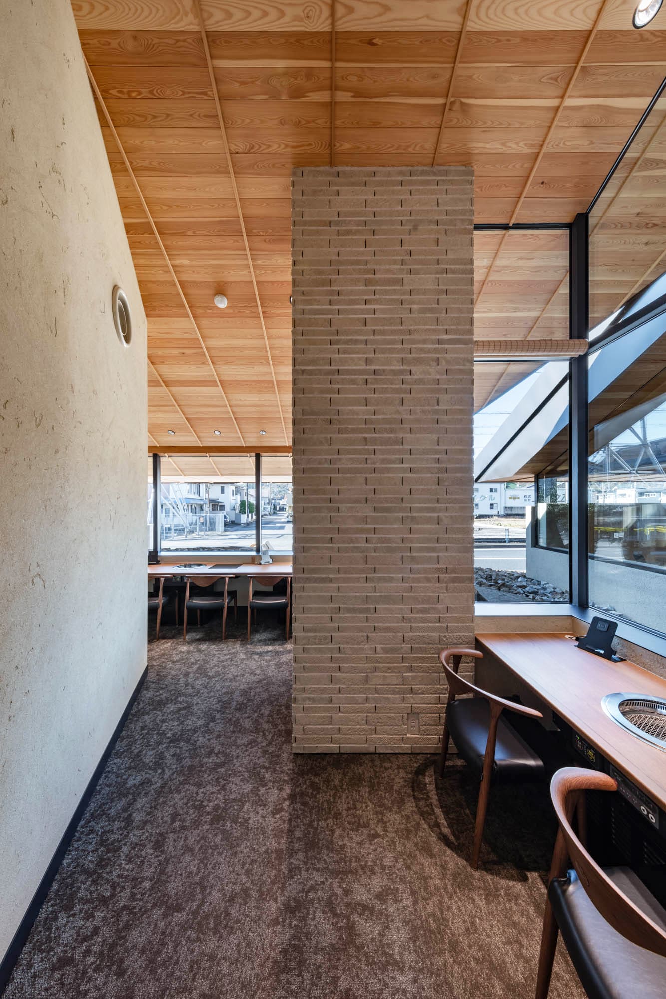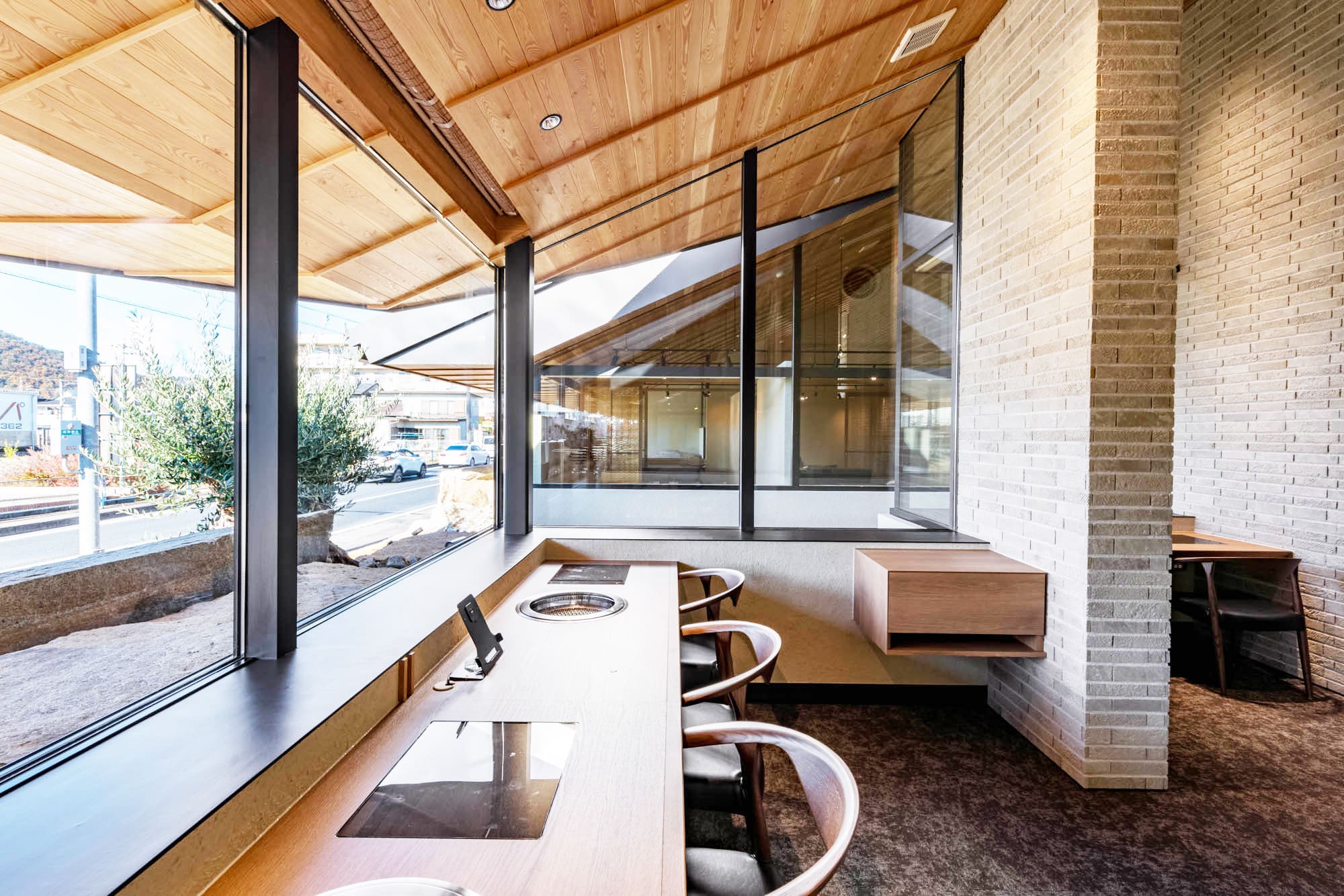 高く美しい板張りの天井、温かみのあるレンガ調の柱、そして大きな窓から見える景色。
