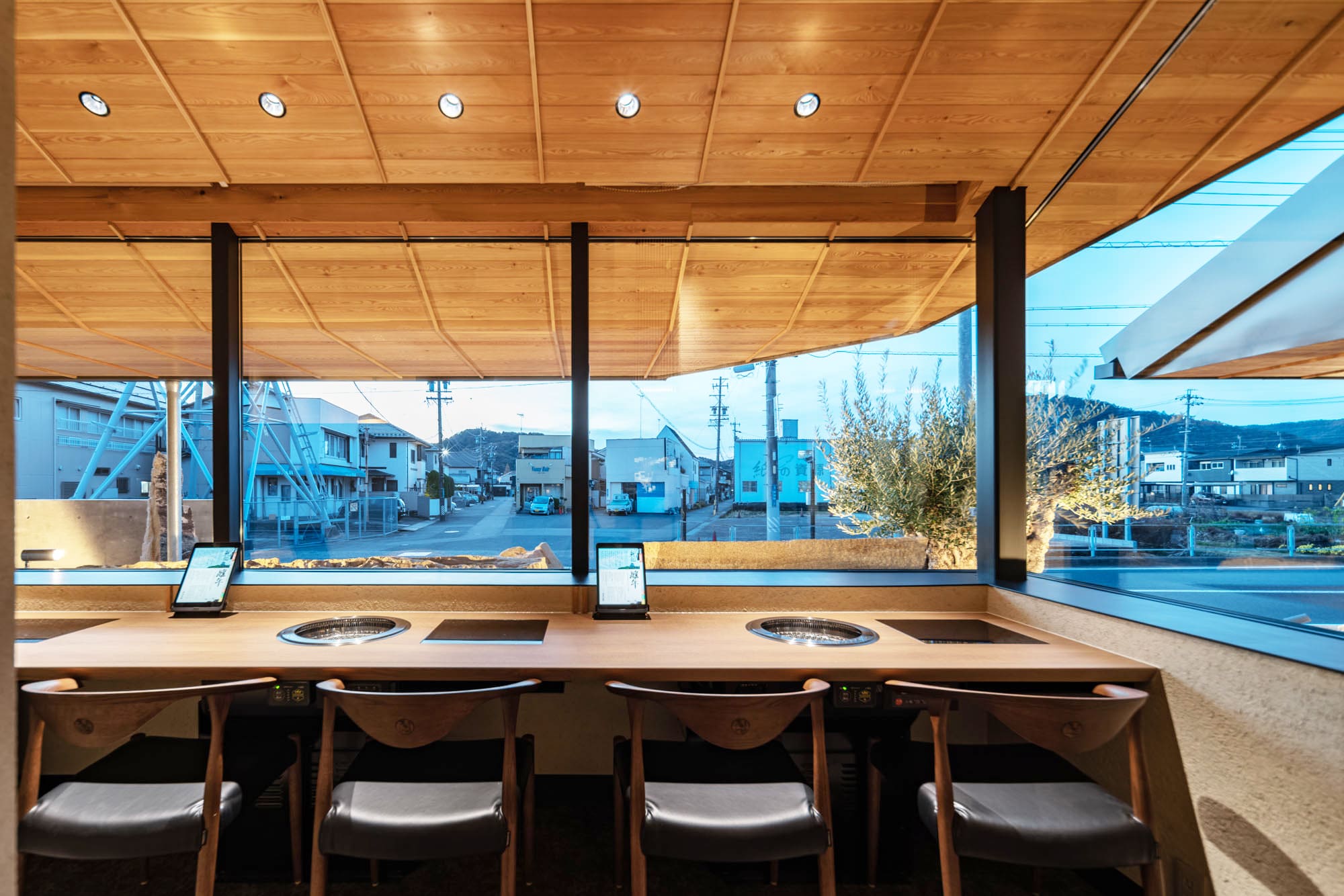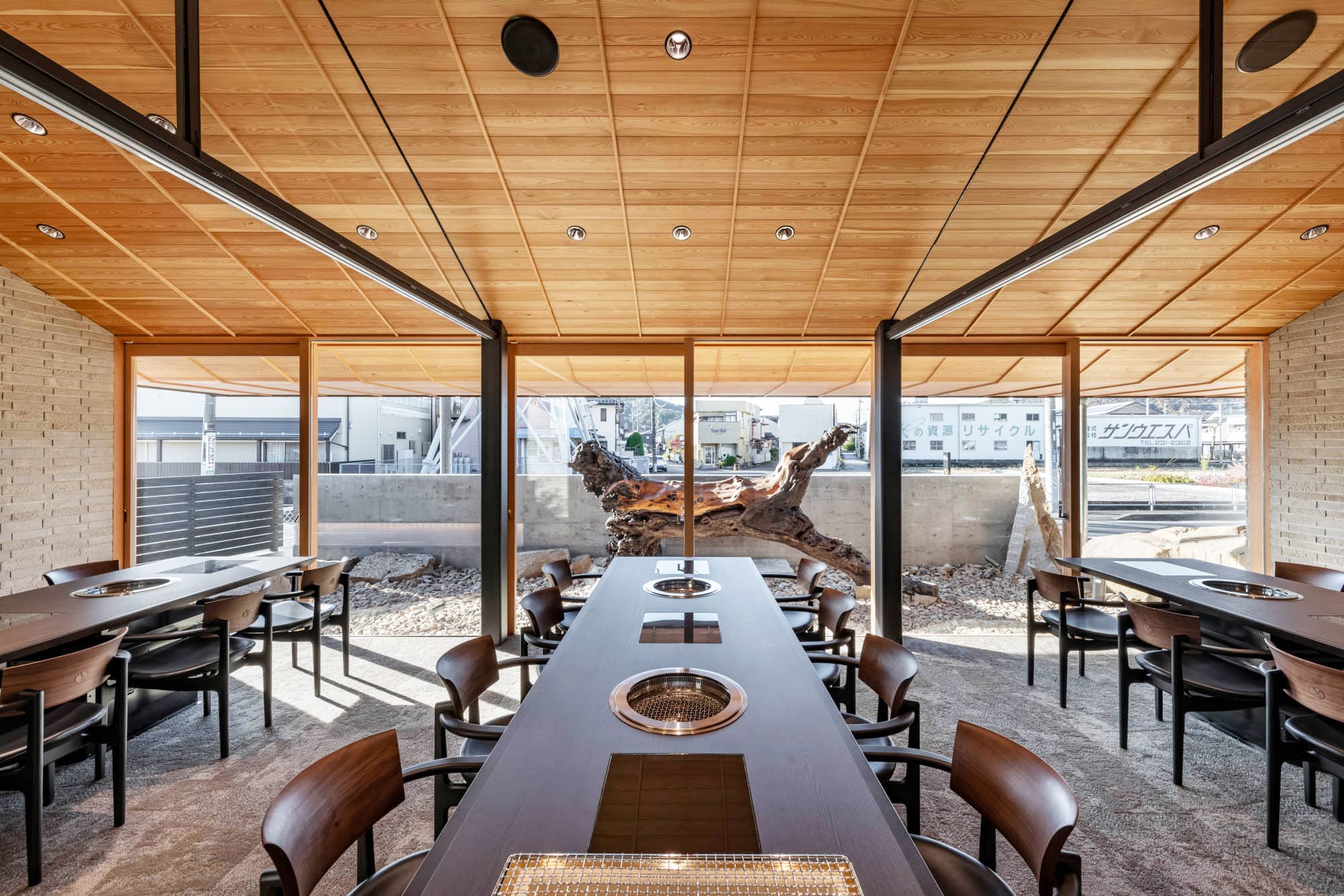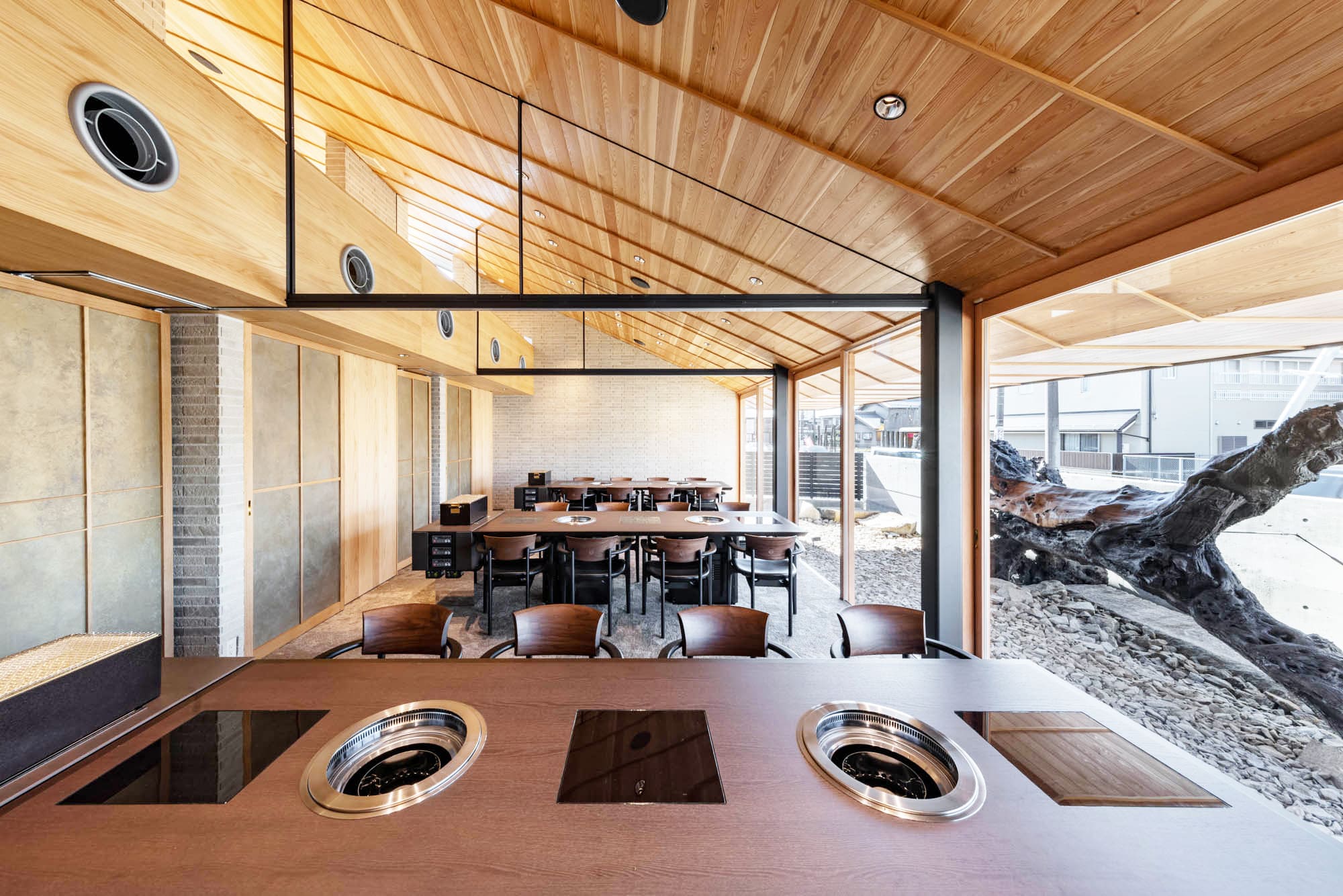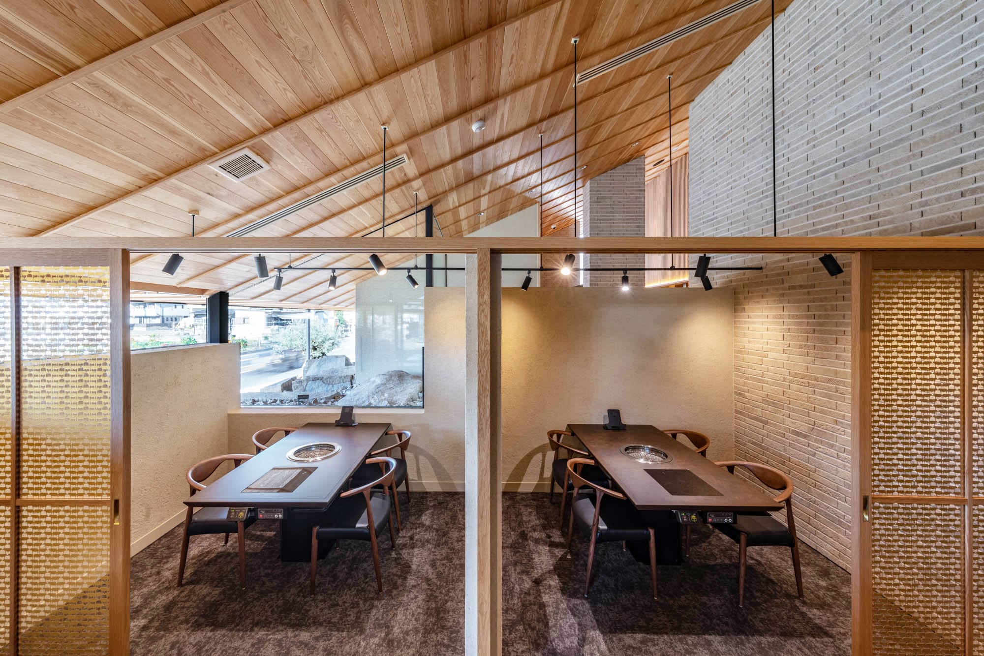 高く美しい板張りの天井、温かみのあるレンガ調の柱、そして大きな窓から見える景色。