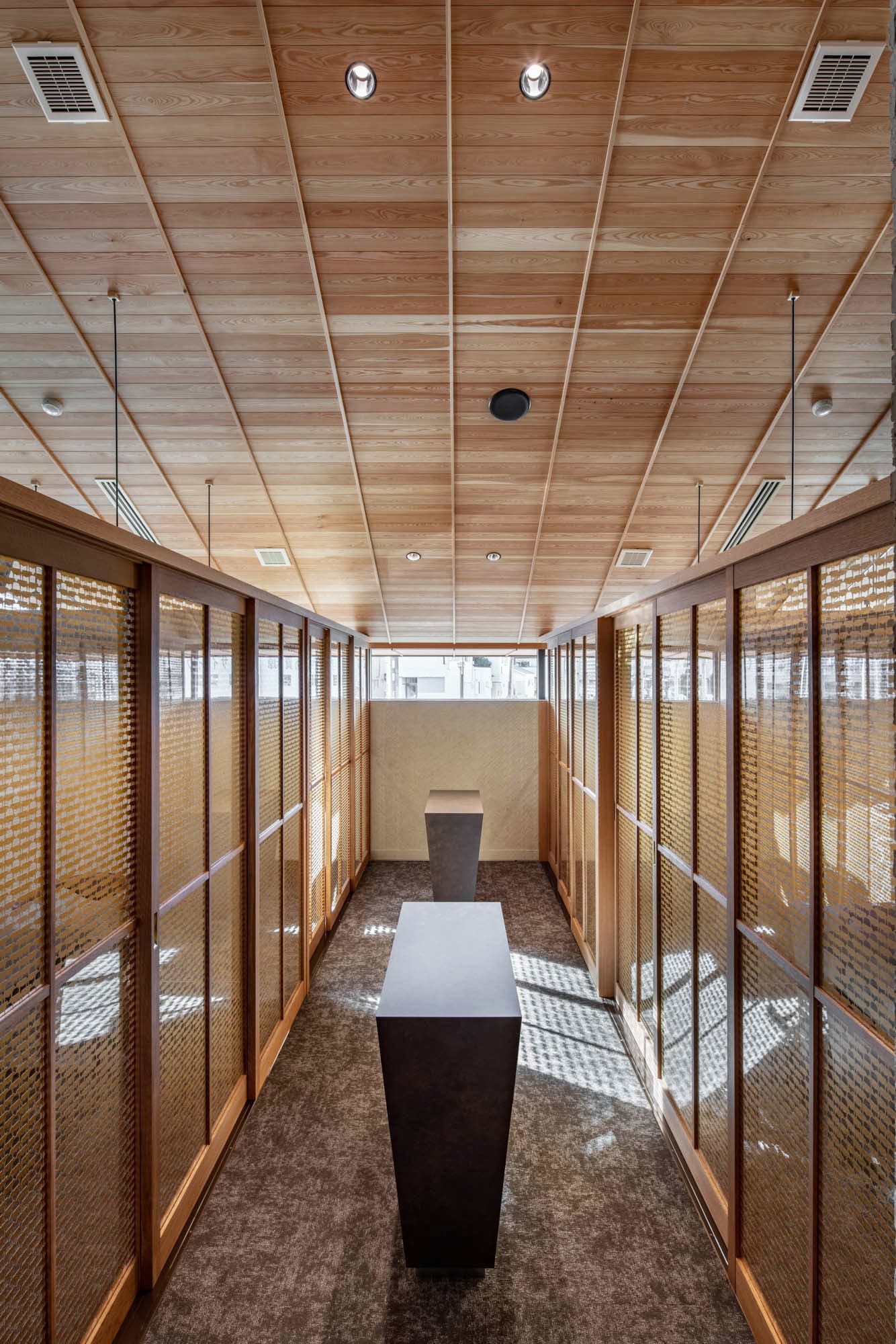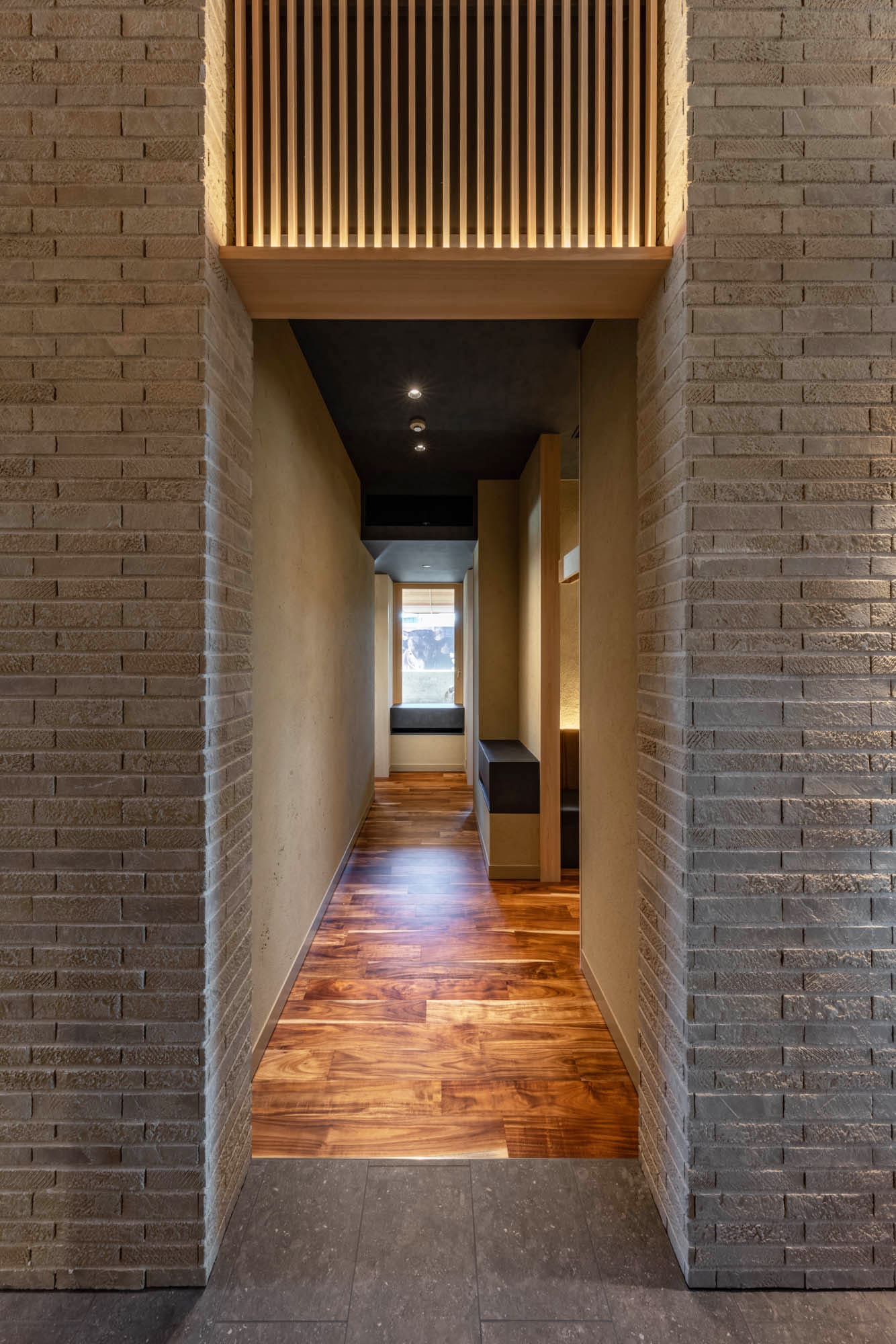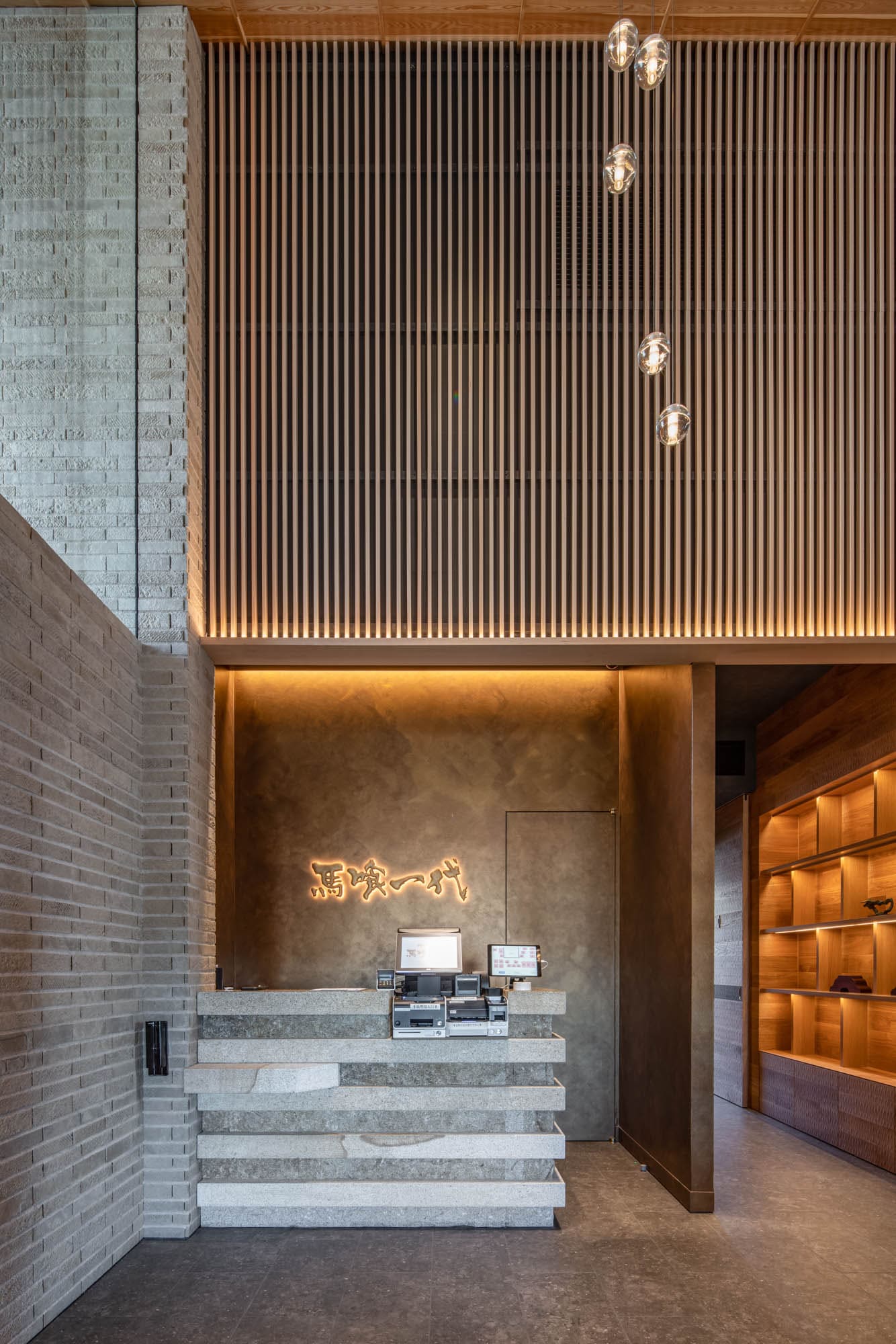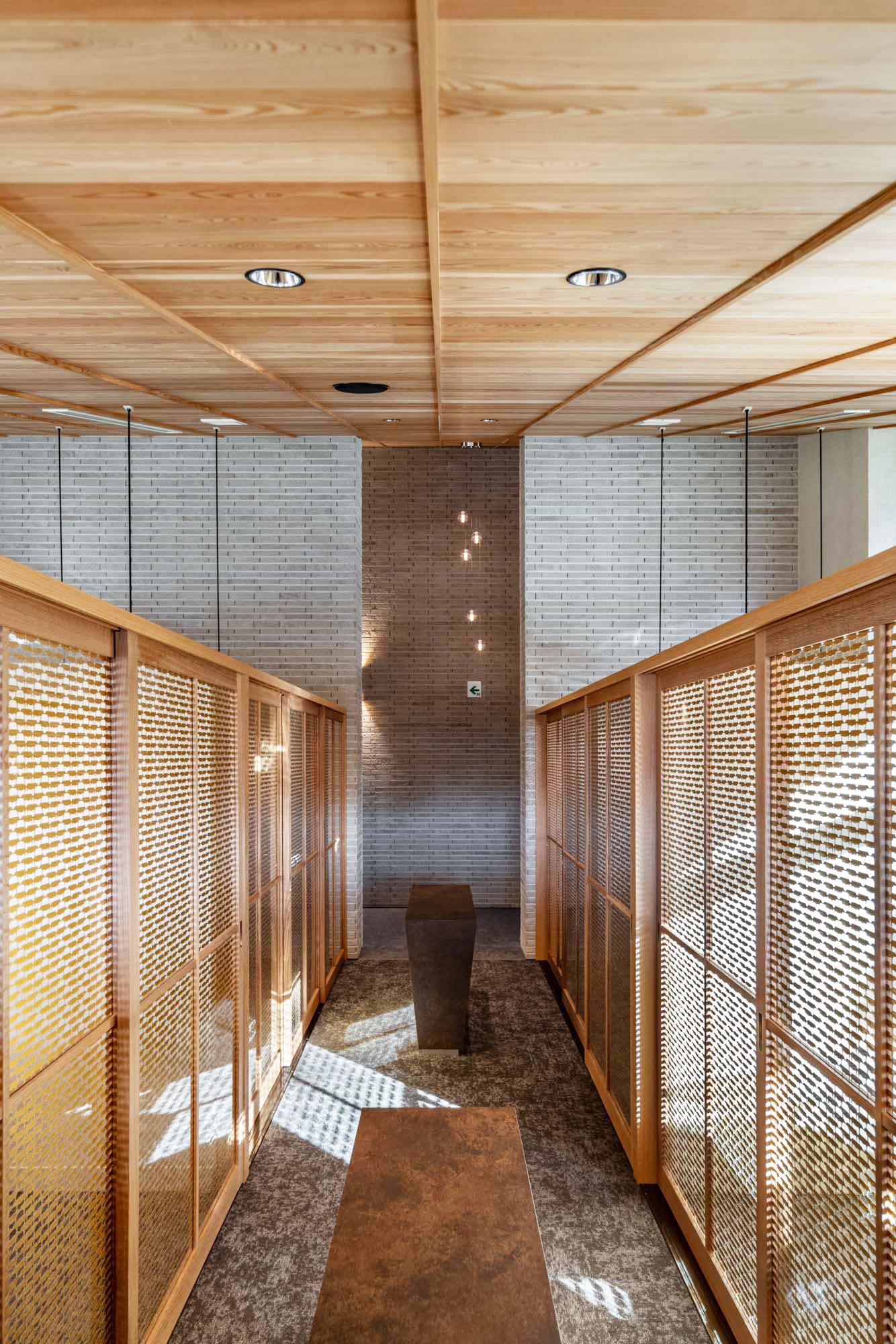 受付カウンターの後ろには、繊細な縦格子が光のオブジェのように輝き、訪れる人を優雅にホールへと導きます。