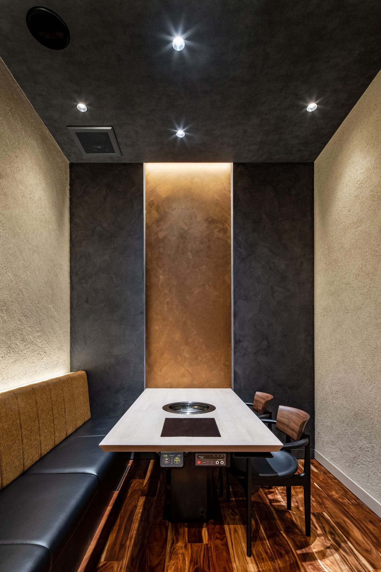 壁にあしらわれた黄金に輝く円形のシンボルは、お店の揺るぎない自信と品格の証。一度見たら忘れられない、記憶に残る風景を創り出します。