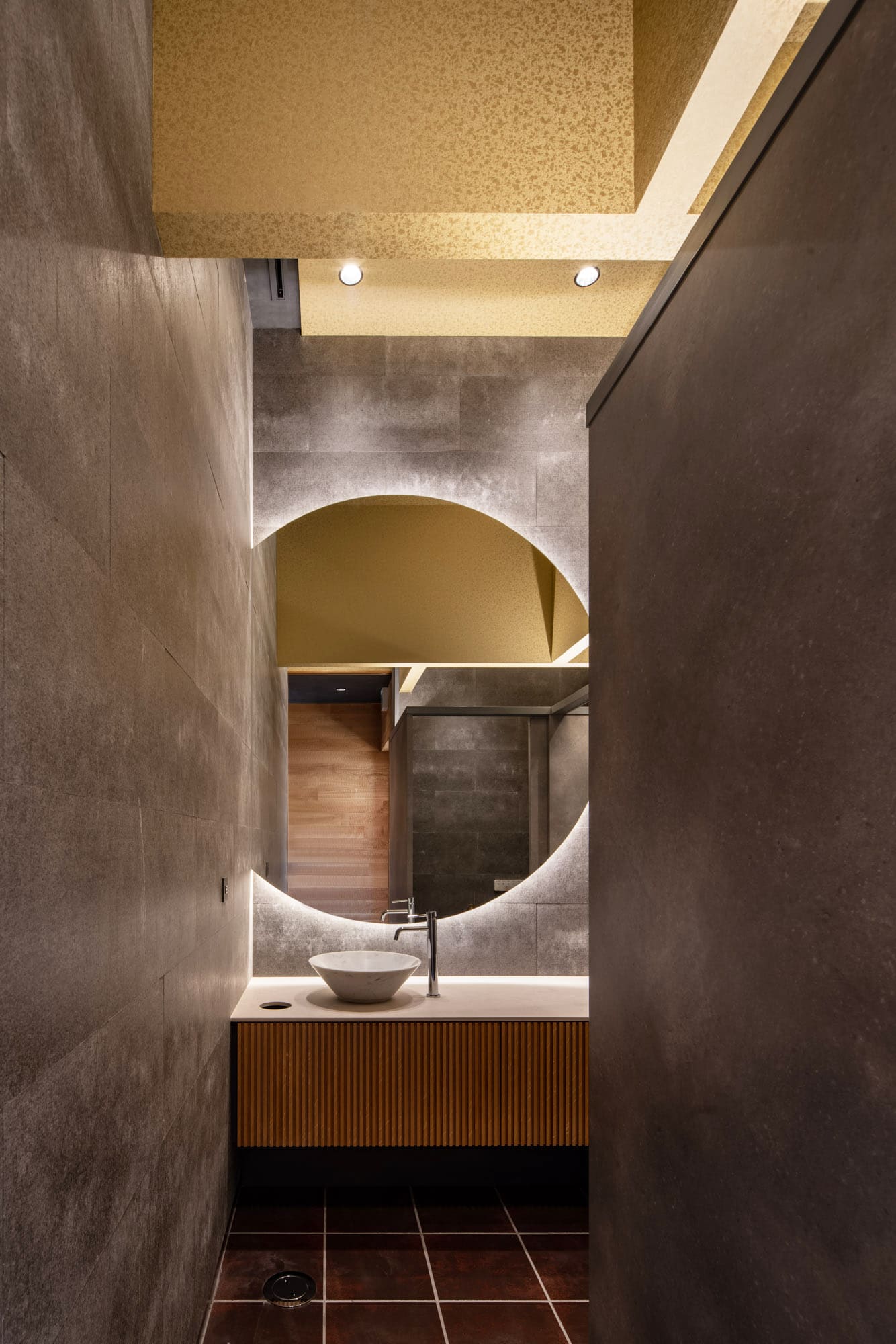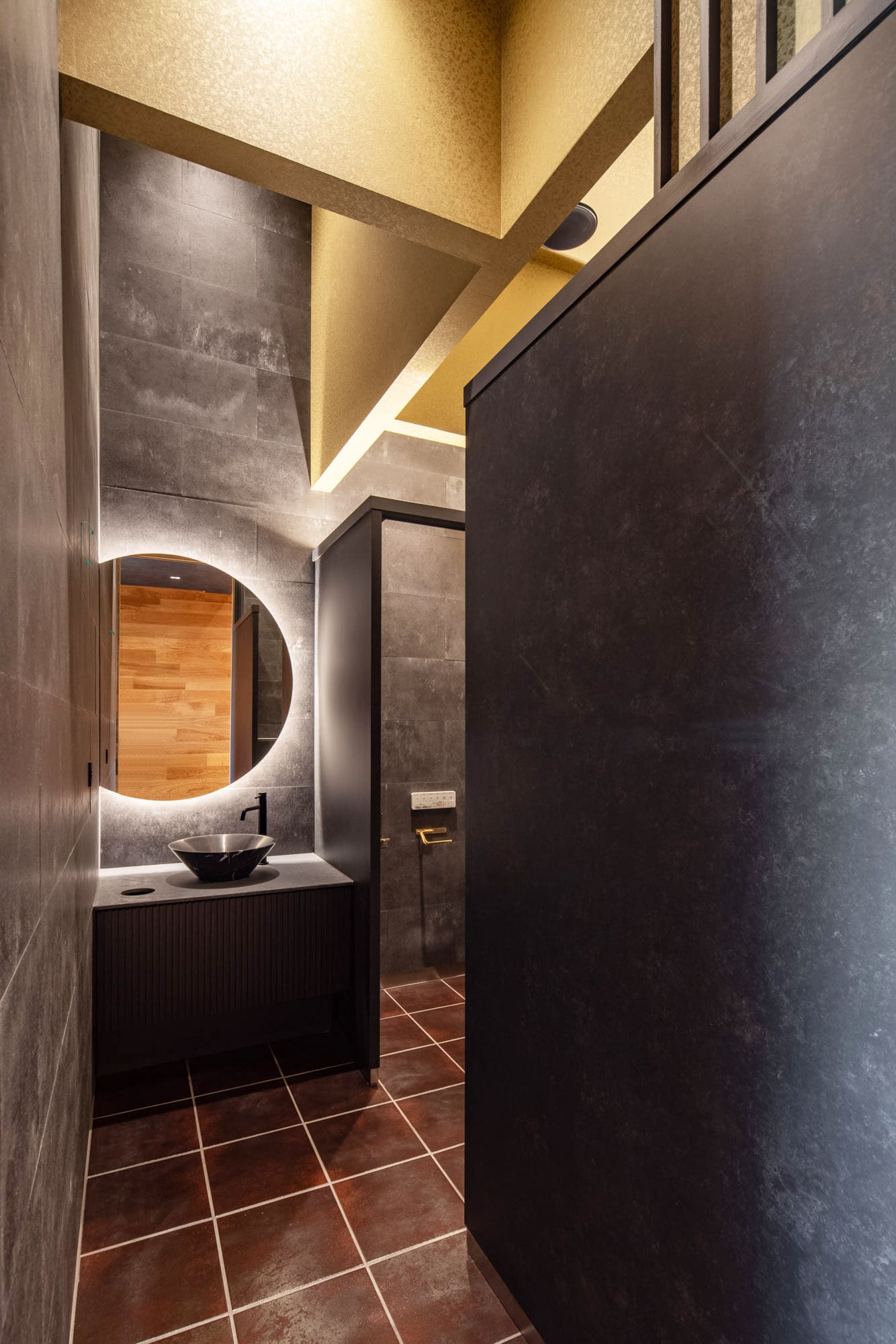 ダークで落ち着いた壁に、優しく光を放つ、大きな円形の鏡。