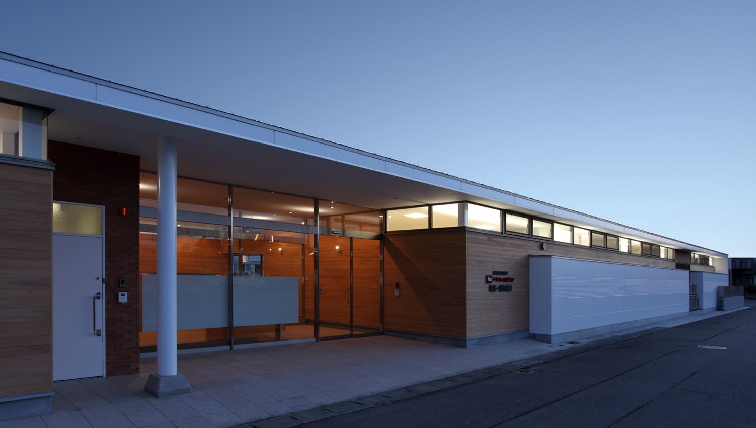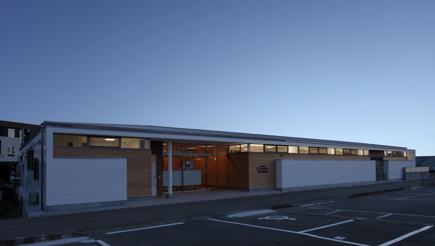 夜には、室内からこぼれる光が、温かい家庭の灯りのように、建物を柔らかく照らし出します。