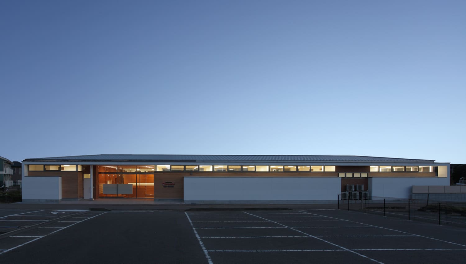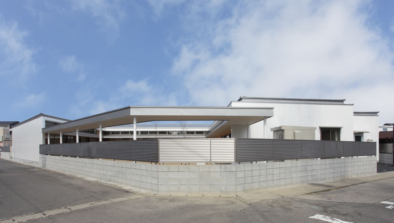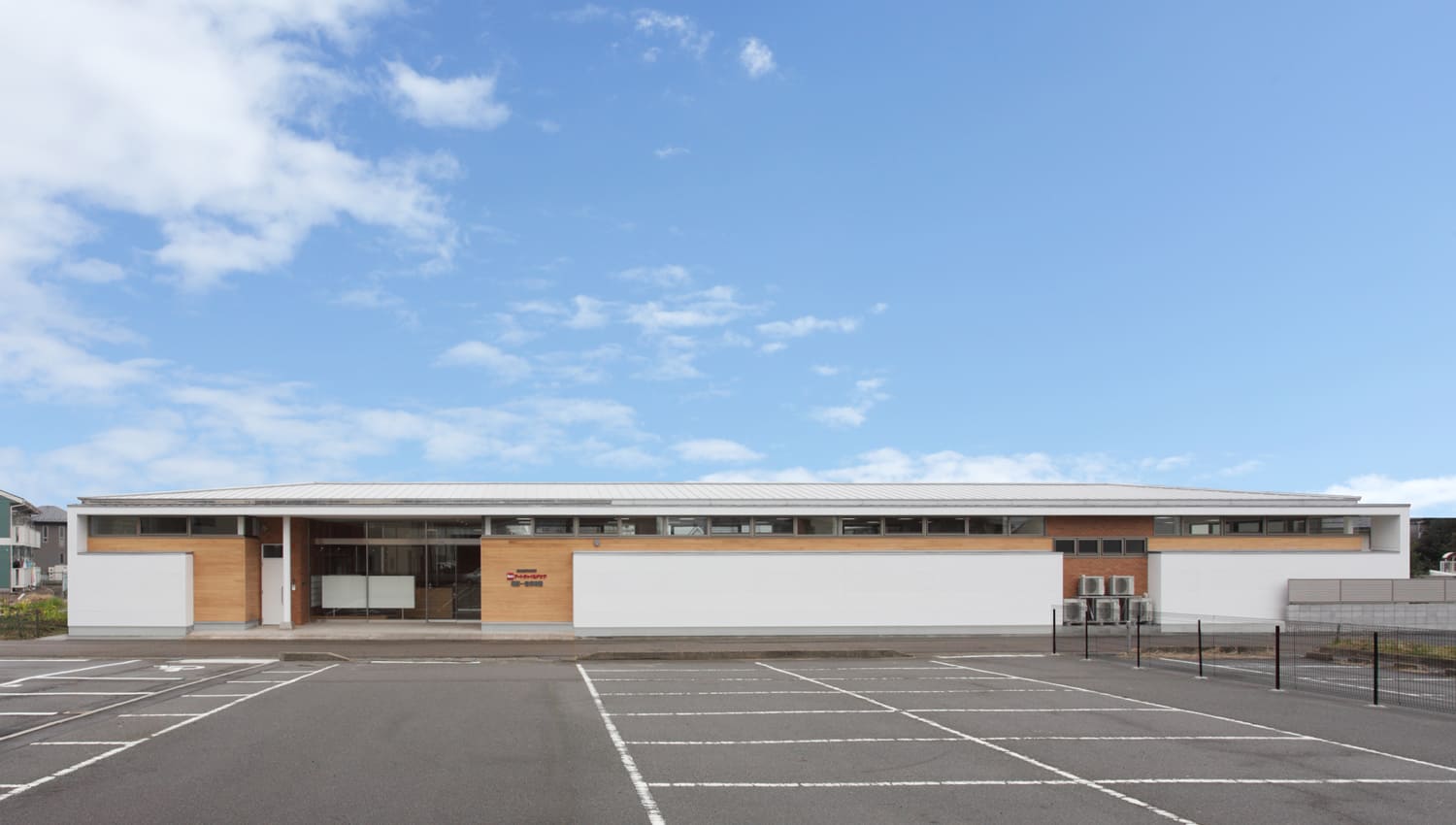 水平に伸びる大きな屋根が、建物全体に落ち着きと安定感を与えています。