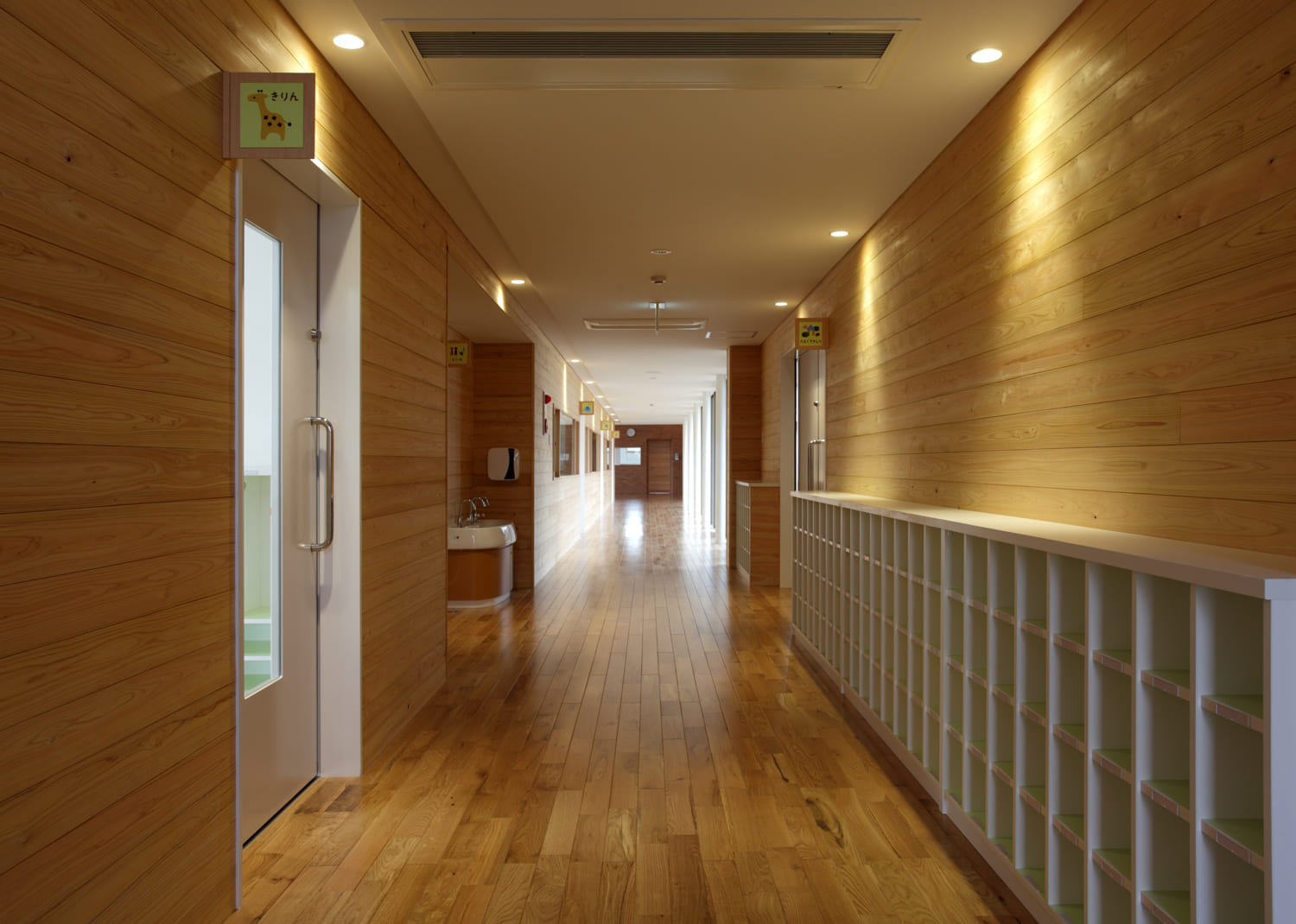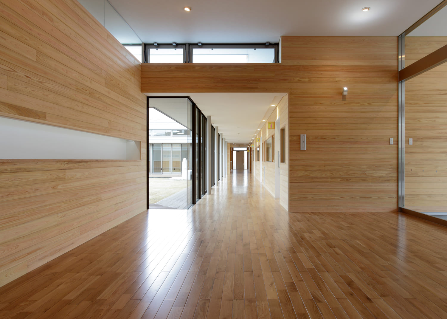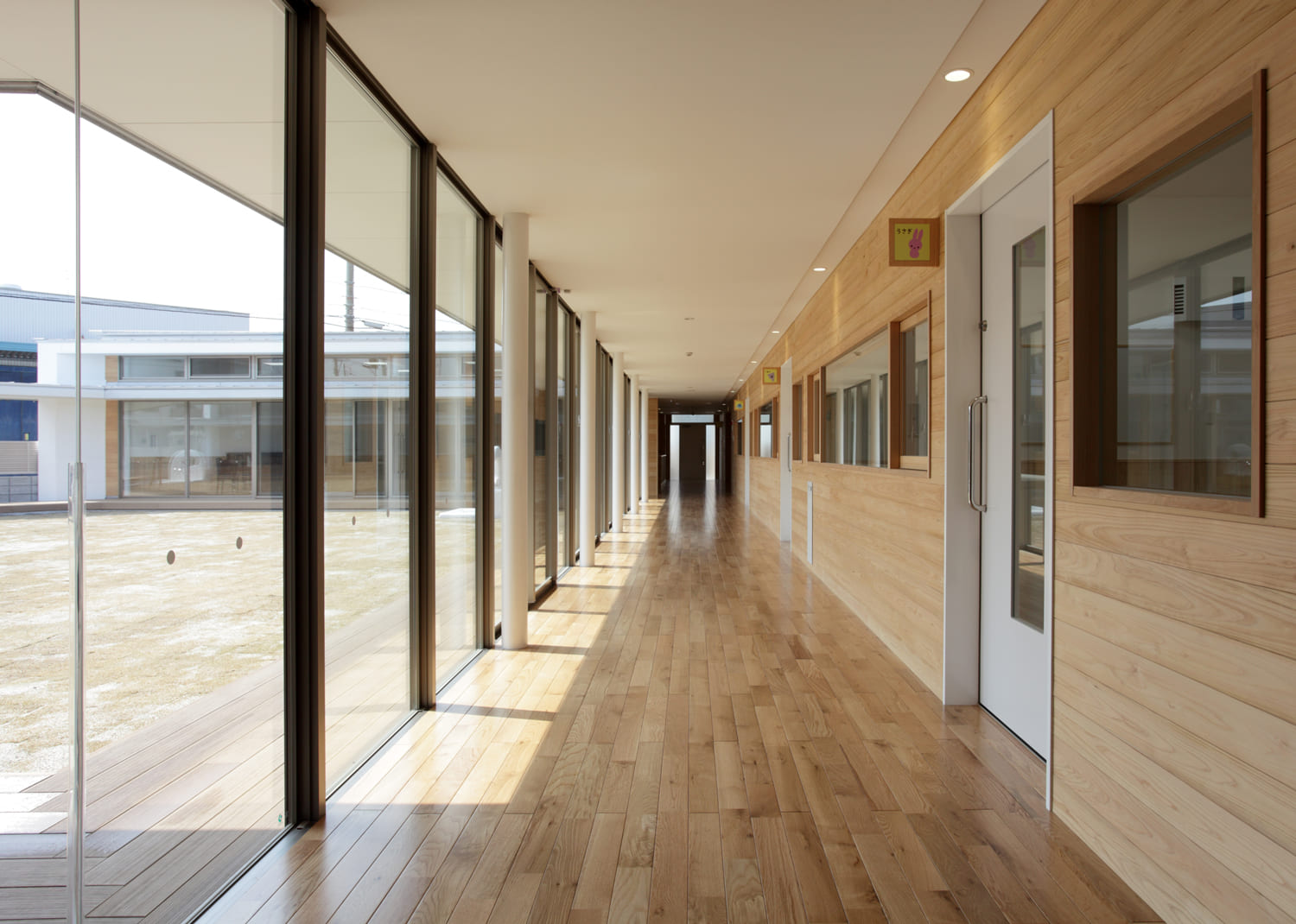 片側がすべてガラス張りになっており、歩きながら、常に中庭の景色や、元気に遊ぶ子どもたちの姿を眺めることができます。