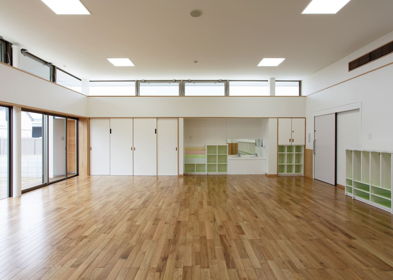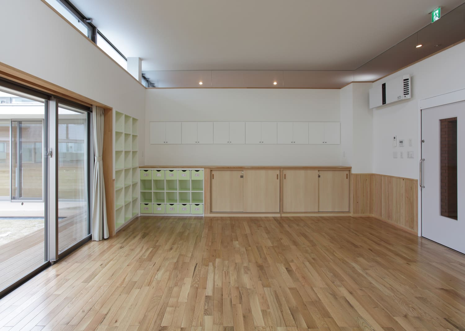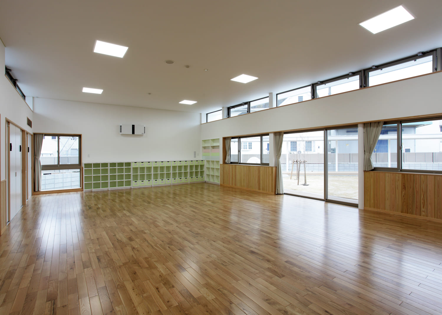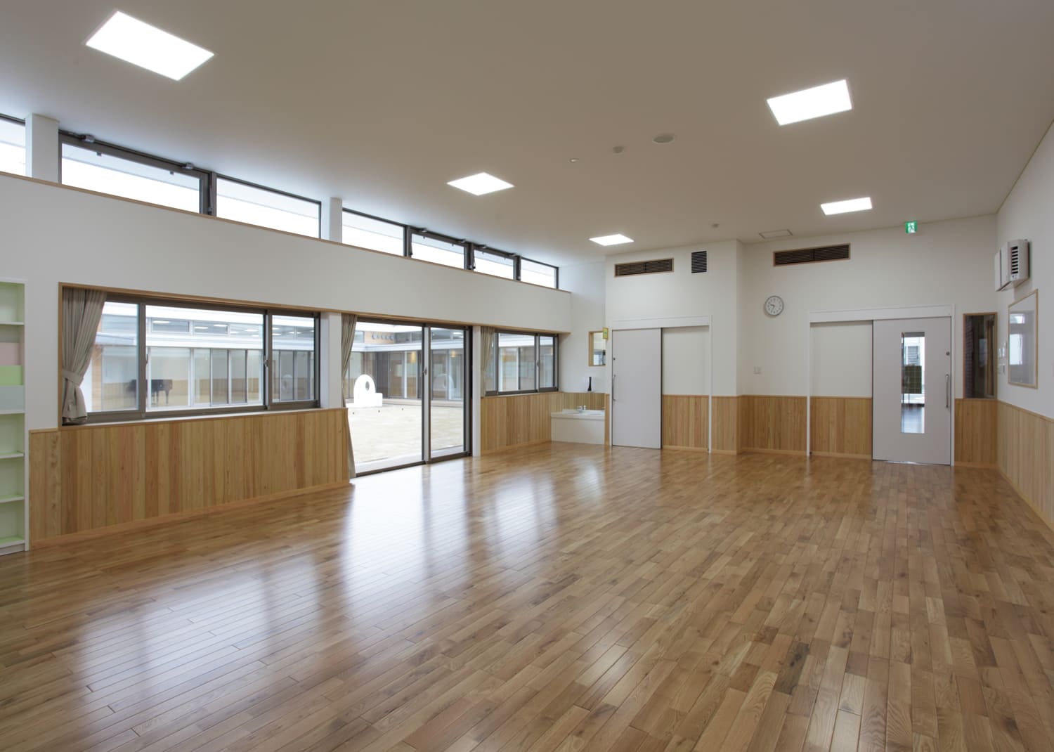 【保育室・ホール】大きな窓を開ければ、部屋と庭がひとつになる。光と風が通り抜ける、開放的な大空間