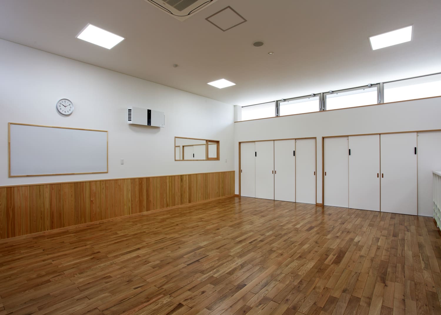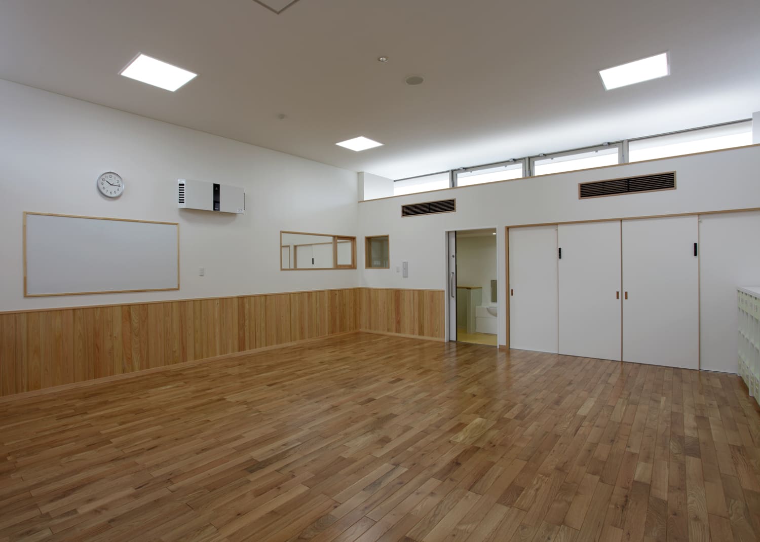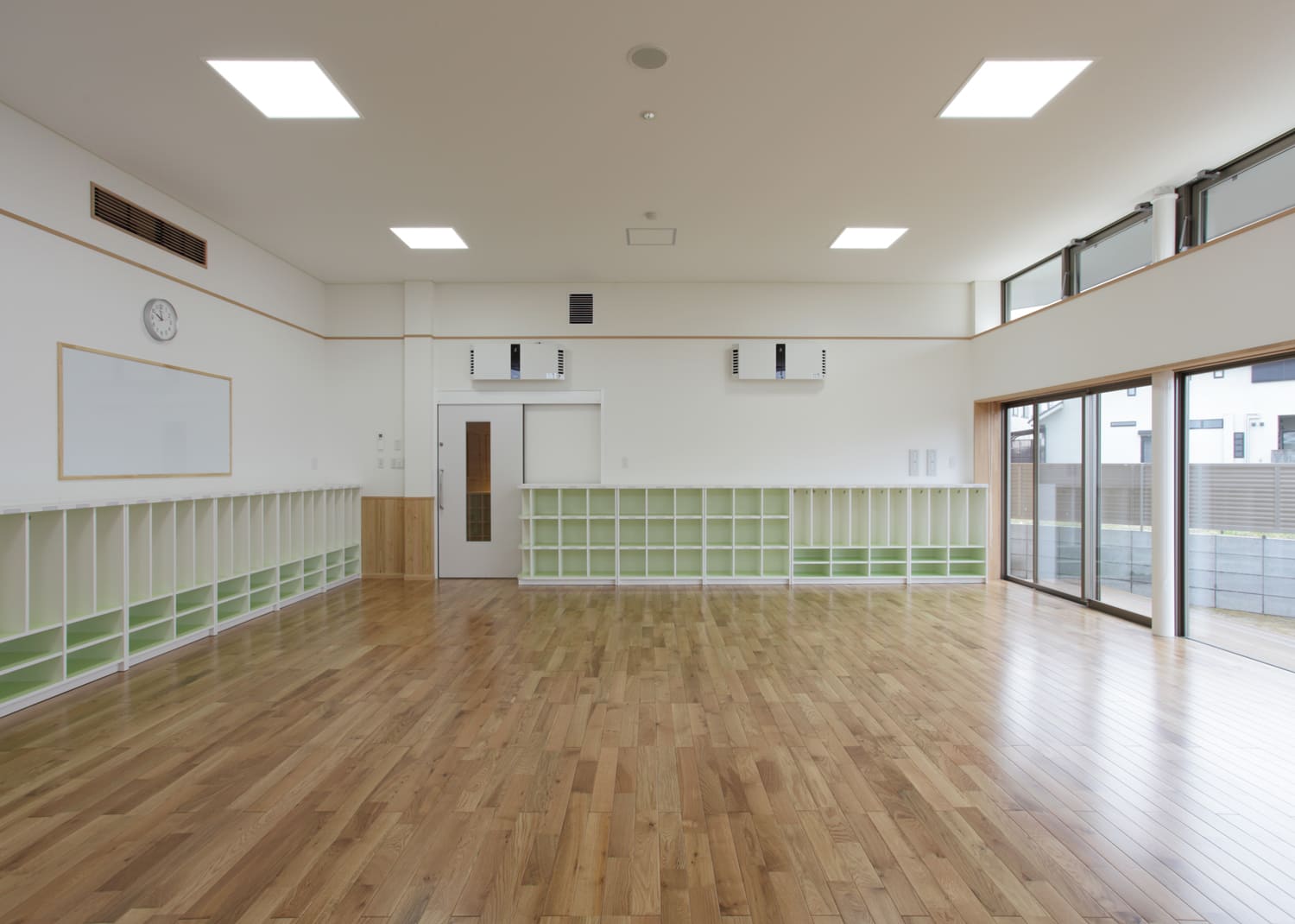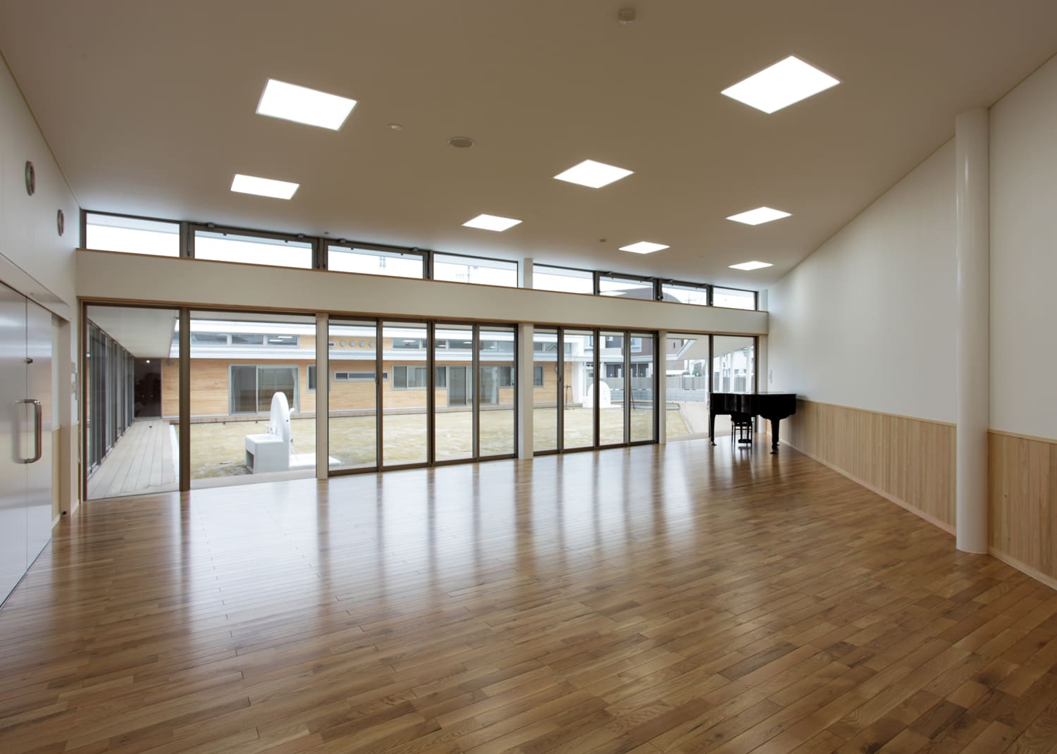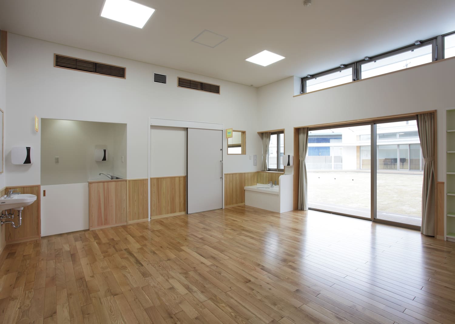 【保育室・ホール】大きな窓を開ければ、部屋と庭がひとつになる。光と風が通り抜ける、開放的な大空間