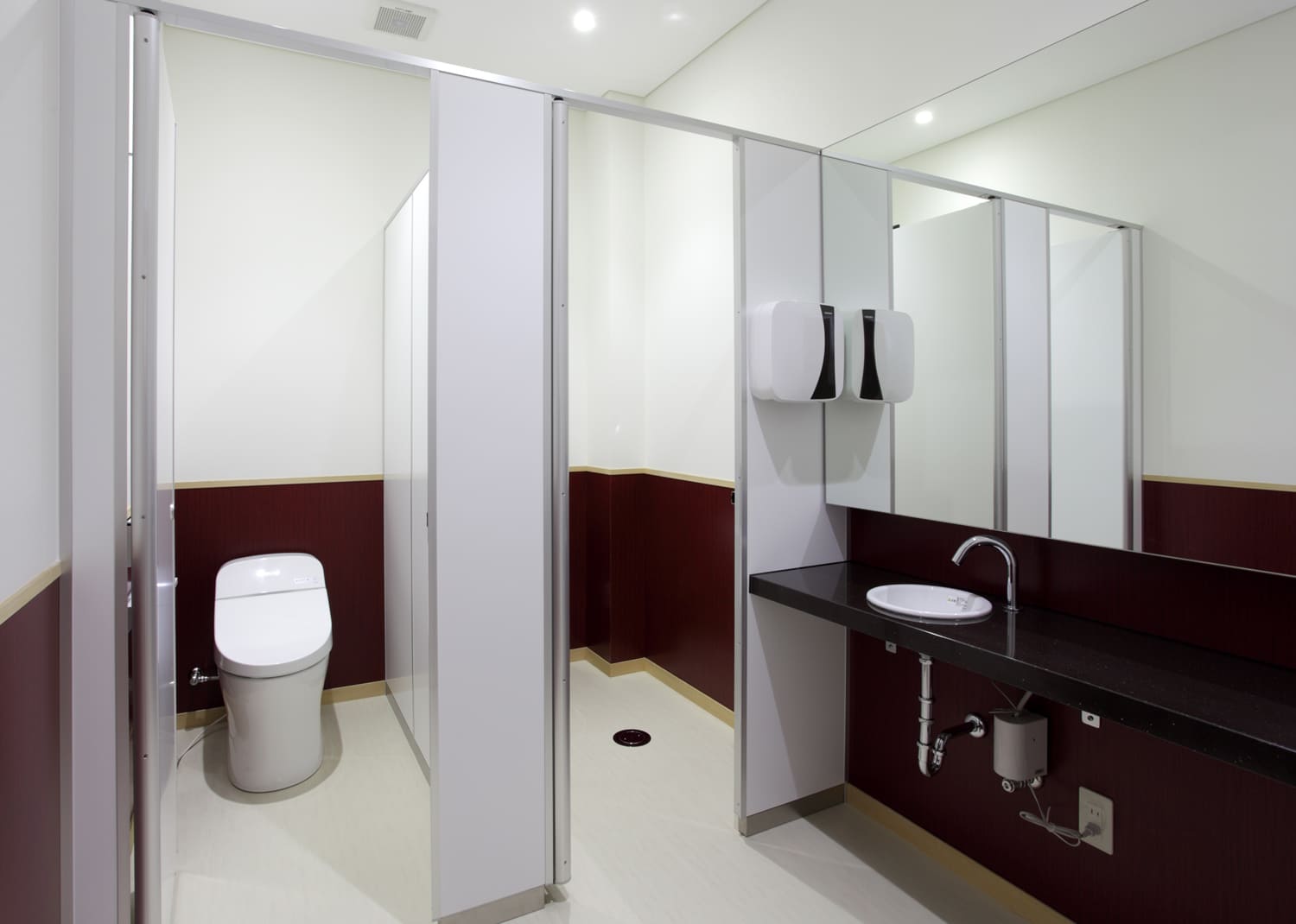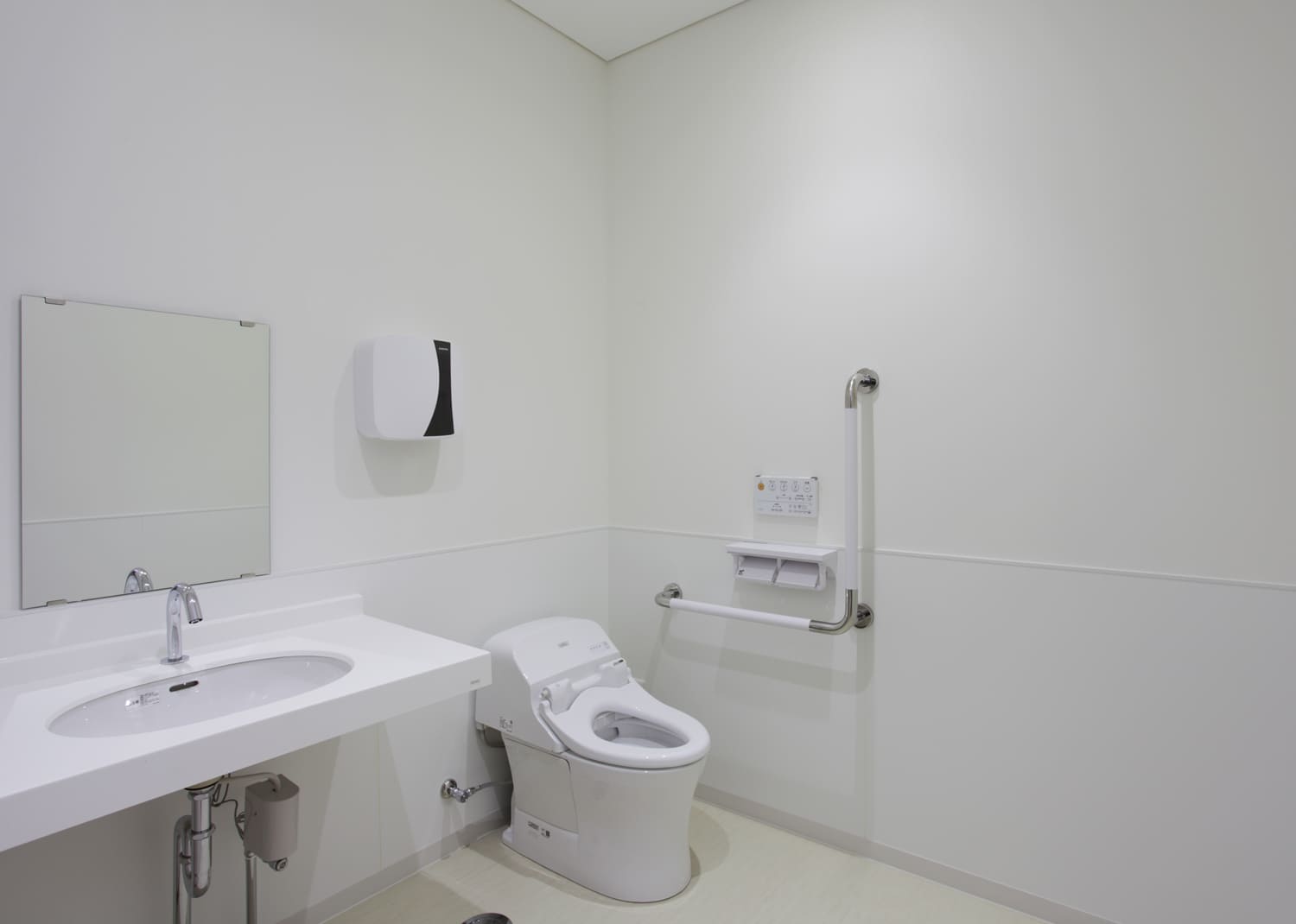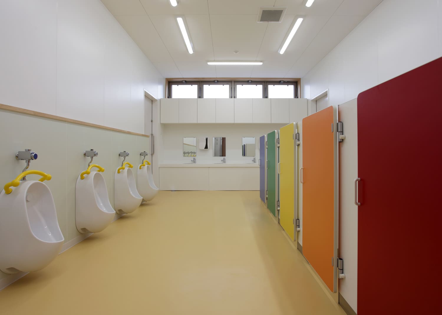 子どもたちが使うトイレは、赤や黄色といった、明るく楽しい色のドアを採用し、毎日を楽しく過ごせるように工夫されています。