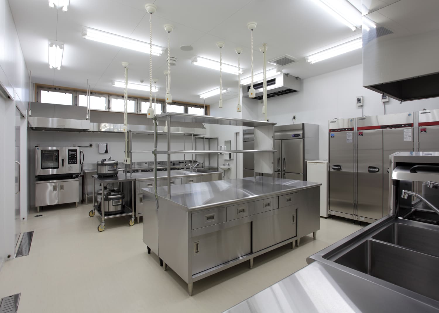 また、みんなの美味しい給食をつくる厨房は、プロ仕様のステンレスで統一された、衛生的で機能的な空間。