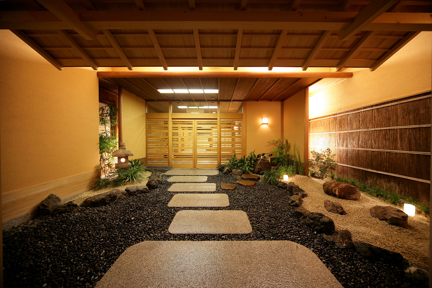 暖簾をくぐると、そこはまるで別世界。黒い玉砂利の上に置かれた飛び石が、奥の玄関へと優雅に誘います。灯籠の柔らかな光に照らし出された木々や苔、そして美しい竹垣。この小さな庭「露地(ろじ)」は、外の喧騒から心を切り離し、静かな時間へと気持ちを整えるための、美しい序章です。住まいに、このような趣のある空間を取り入れることは、日々の暮らしに深い潤いと安らぎを与えてくれます。